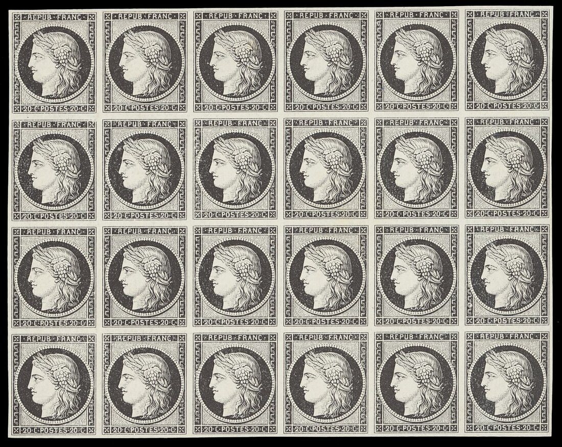20c. black on white, block of twenty-four (6x4) with large margins, unused without gum, light bend through the second vertical row, otherwise fresh and fine. A rare and impressive first issue block. Scheller Certificate (2007), Spink Maury 3a