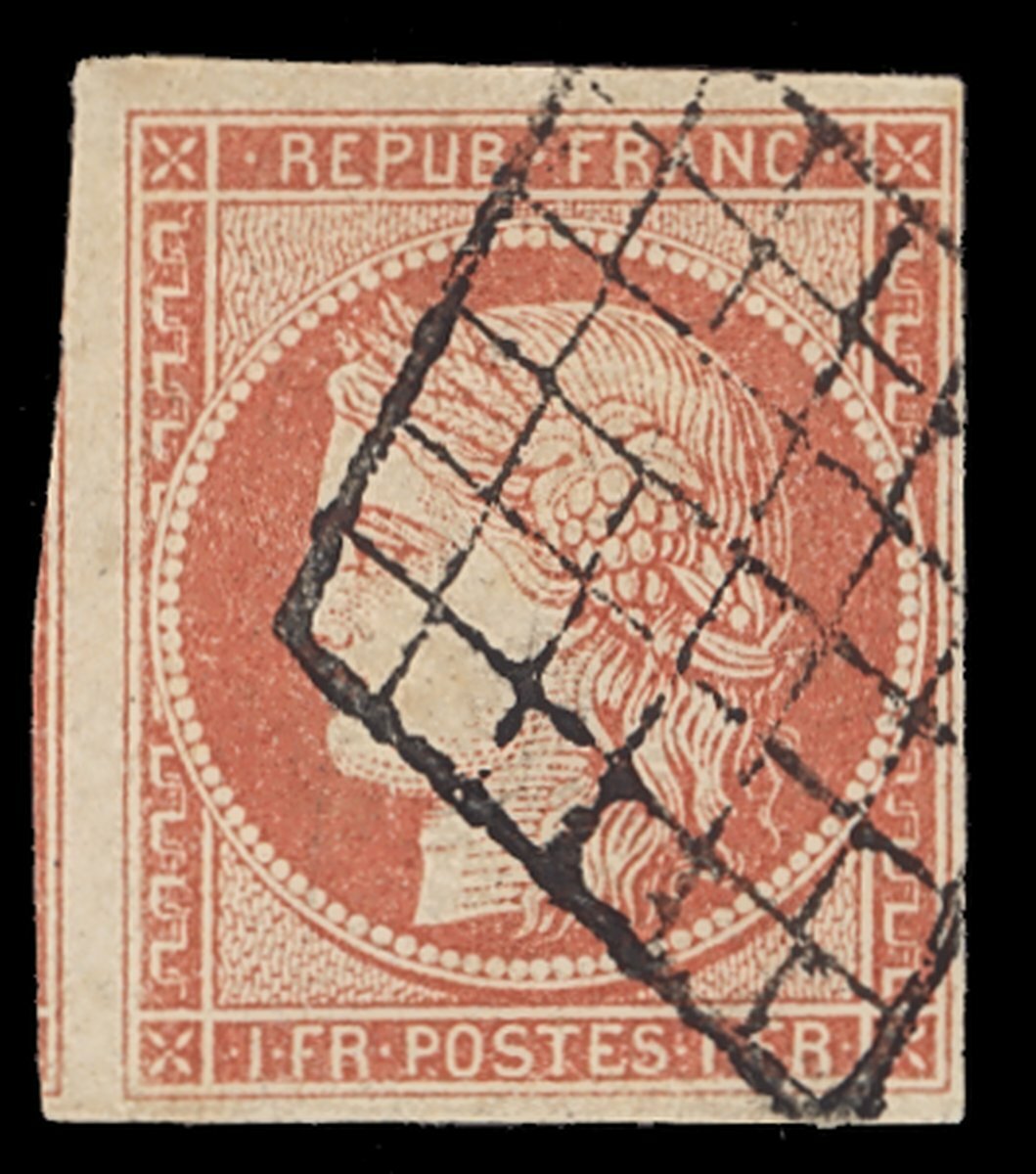 1f. bright vermilion, lozenge cancellation, good to very large margins and showing a portion of the adjoining stamp at left. Small paper inclusion and tiny light corner bend otherwise a glorious example of this rare shade. Signed Brun, with Behr Certificate (2015), Spink Maury 7a, €25,500