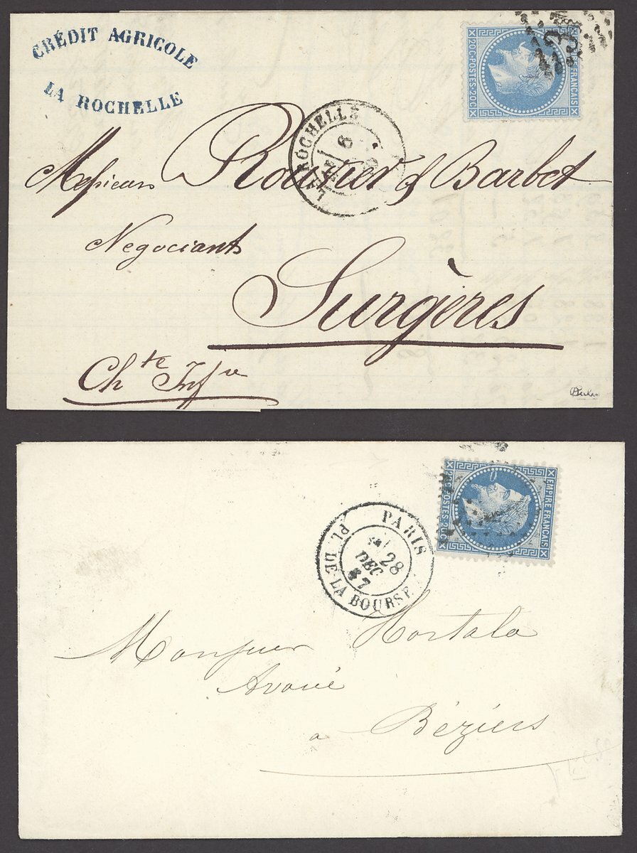 20c. blue, "à la corne" and "à la pipe" varieties, used on separate entire letters, fine. Spink Maury 29IId, 29IIf