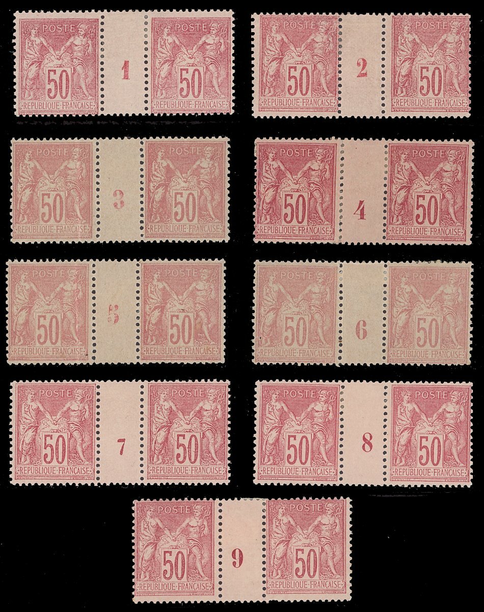 1877-90, Type II, N under U 50c. rose, the set of nine Millésime pairs (1-9), original gum, number 7 unmounted mint; chiefly fine. Spink Maury 98