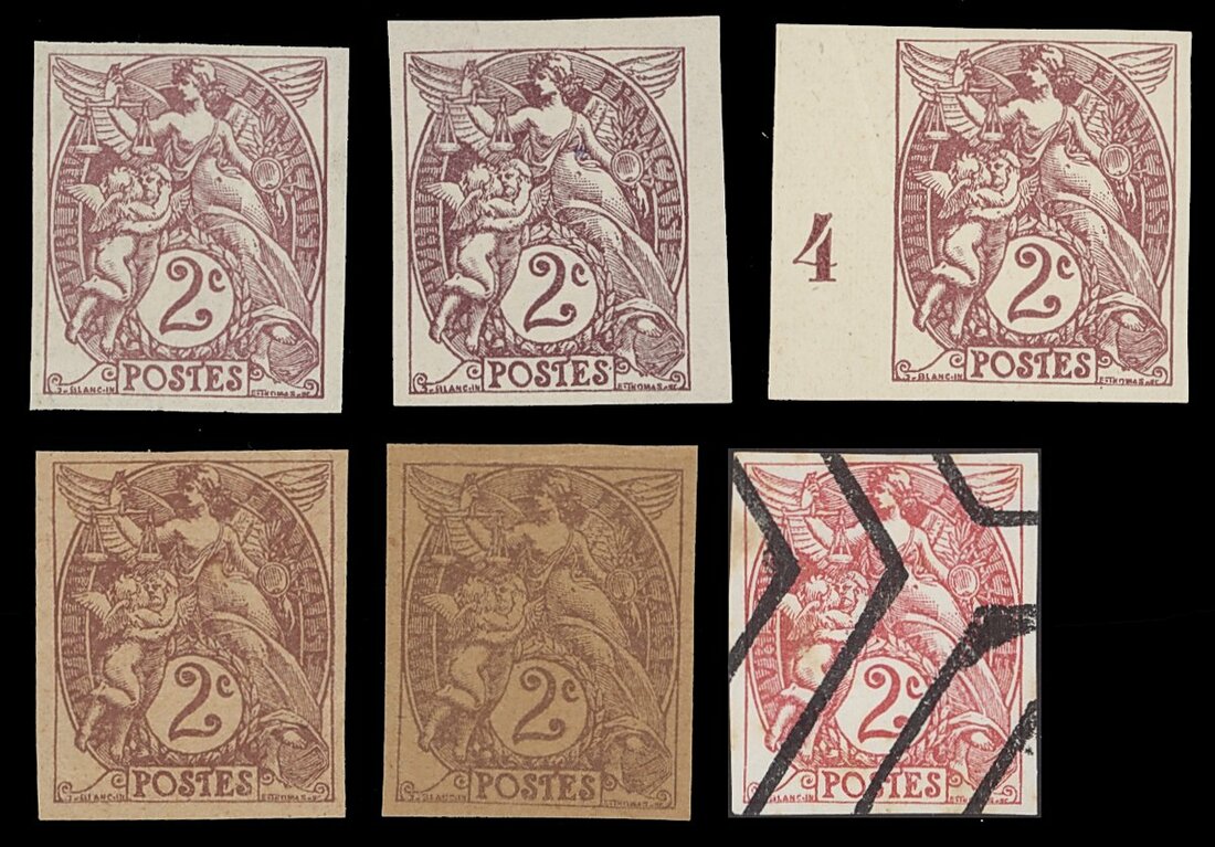 2c. variety "imperforate" selection (6), including unmounted, no gum (2, one with "4" millesime), papier GC (2 mint), and a used with "rebuts" cancel, Spink Maury 108 .