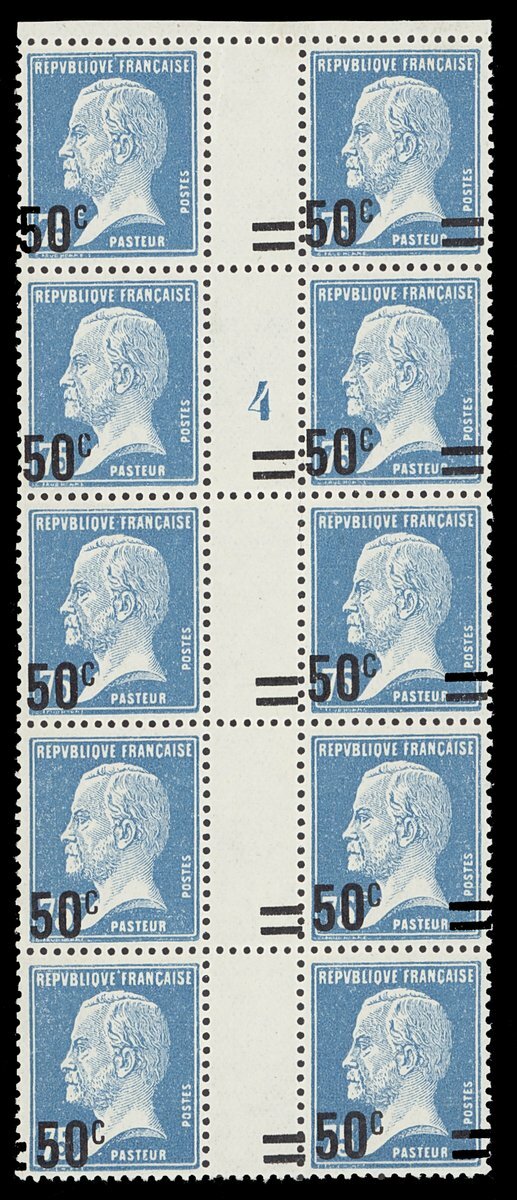 50c. on 75c. blue, block of ten (2x5) with vertical interpanneau margin, showing surcharge misplaced to right leaving the left hand vertical strip with bars omitted and the right hand strip with value over value; unmounted mint. A stunning block. Spink Maury 219c, g, €26,175