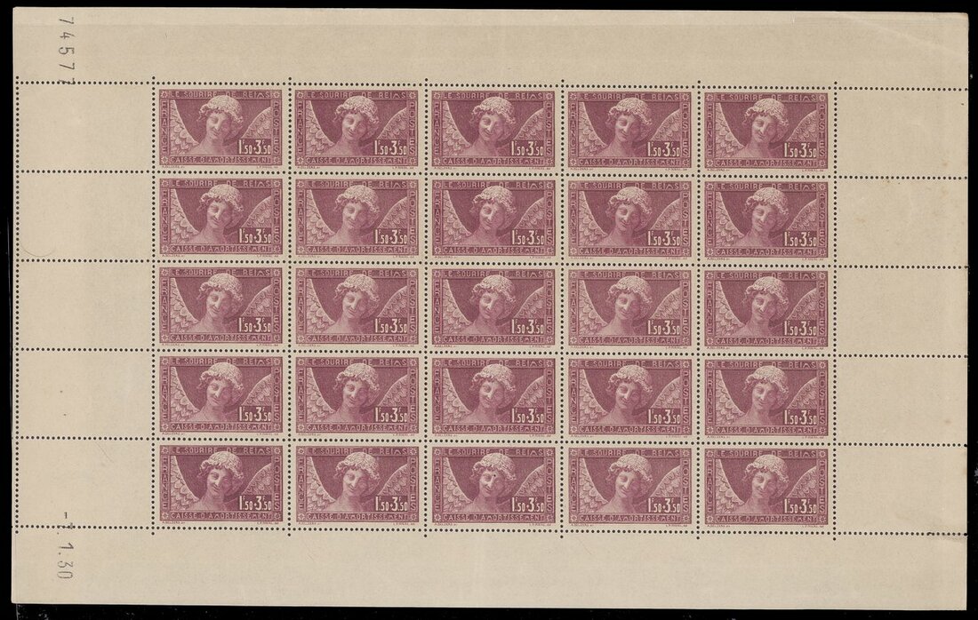 1fr.50 + 3fr.50, complete pane of twenty-five with Coin Date; toned and glazed gum. S.G. 480, £3,000+; Spink Maury 256, €4,200+