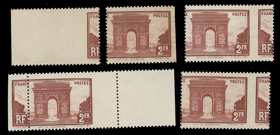 2f. brown-lake, a group of mis-perforated printing errors (5), including some wildly off-centre examples and striking perforation varieties; a good group, large part original gum or unmounted mint, one signed Roumet and Calves. Spink Maury 258 var.