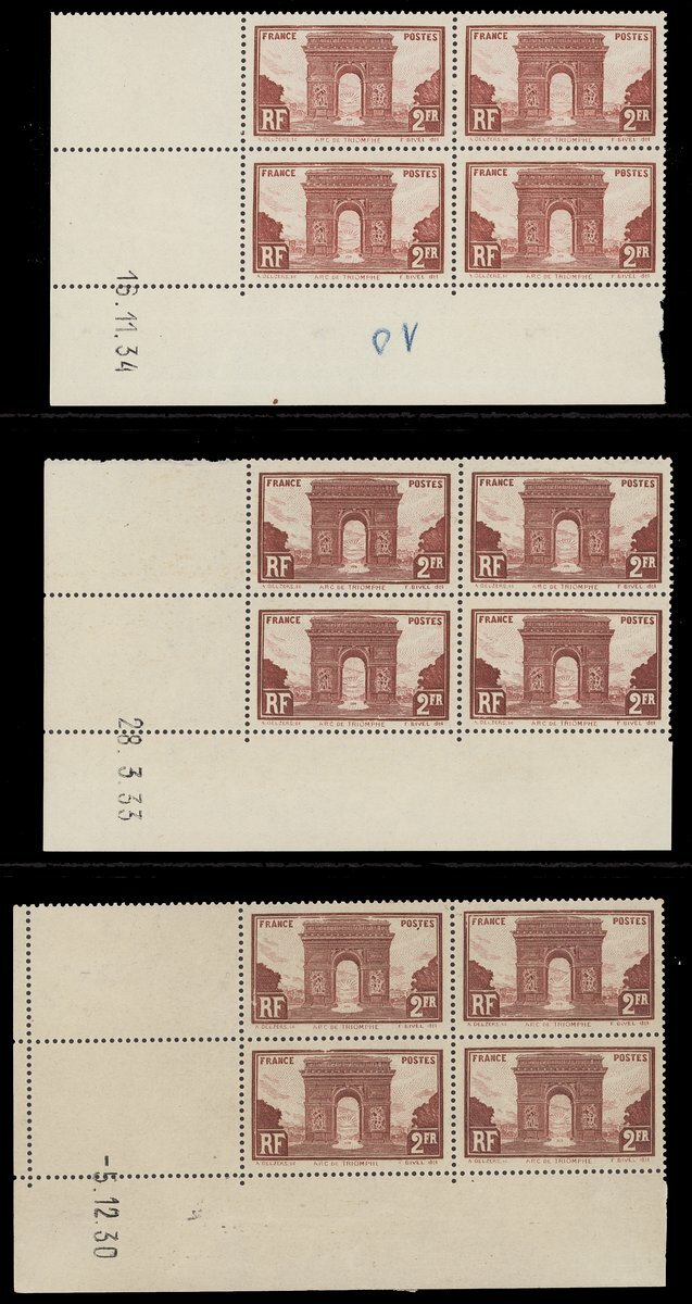 2f. brown-lake, Coin-Date blocks of four (5) dated: 2.12.30, 5.12.30, 28.3.33, 16.5.33 and 15.11.34 and Coin Date-corner single example dated 2.11.34; unmounted mint. Spink Maury 258, €2,500+