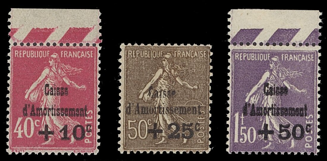 1930 Caisse d'amortissement (4th series) set of three to 1f.50 +50c. violet, 40c. +10c. and 1f.50 +50c. both marginal from the top of the sheet; original gum. Spink Maury 266-268, €438