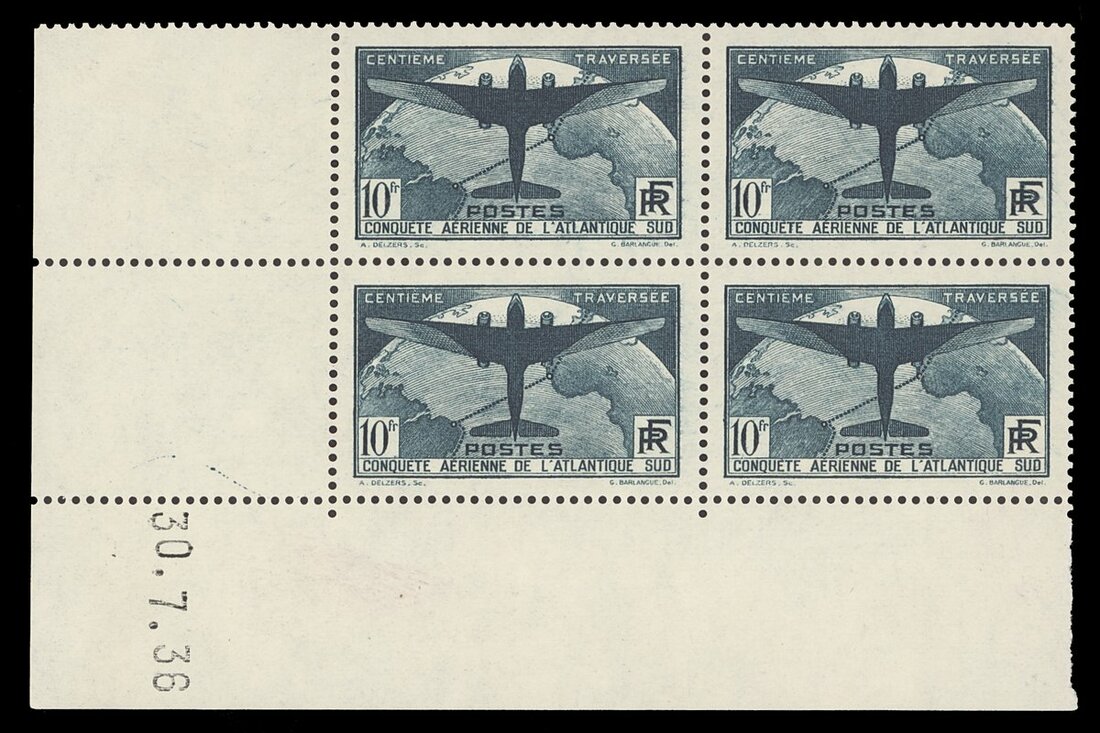 10f. myrtle-green, block of four from the lower left corner of the sheet with coin daté (30.7.36), unmounted mint, hinged in the margin; fine. Spink Maury 321, €3,280