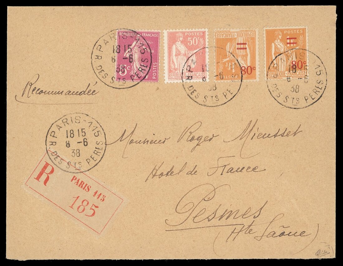 80c. on 1f. orange, surcharge inverted, used with a normal, Sower 5c. and Pax 50c. on envelope dated 8 June 1938 registered from Paris; fine. Spink Maury 359IIBi