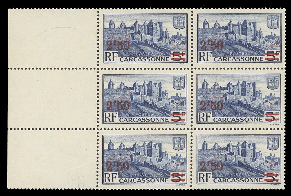 2f. 50 on 5f. blue, surcharge double, block of six (2x3) from the left of the sheet, unmounted mint; some minor staining, fine and a rare block. Spink Maury 490c, €2,700+