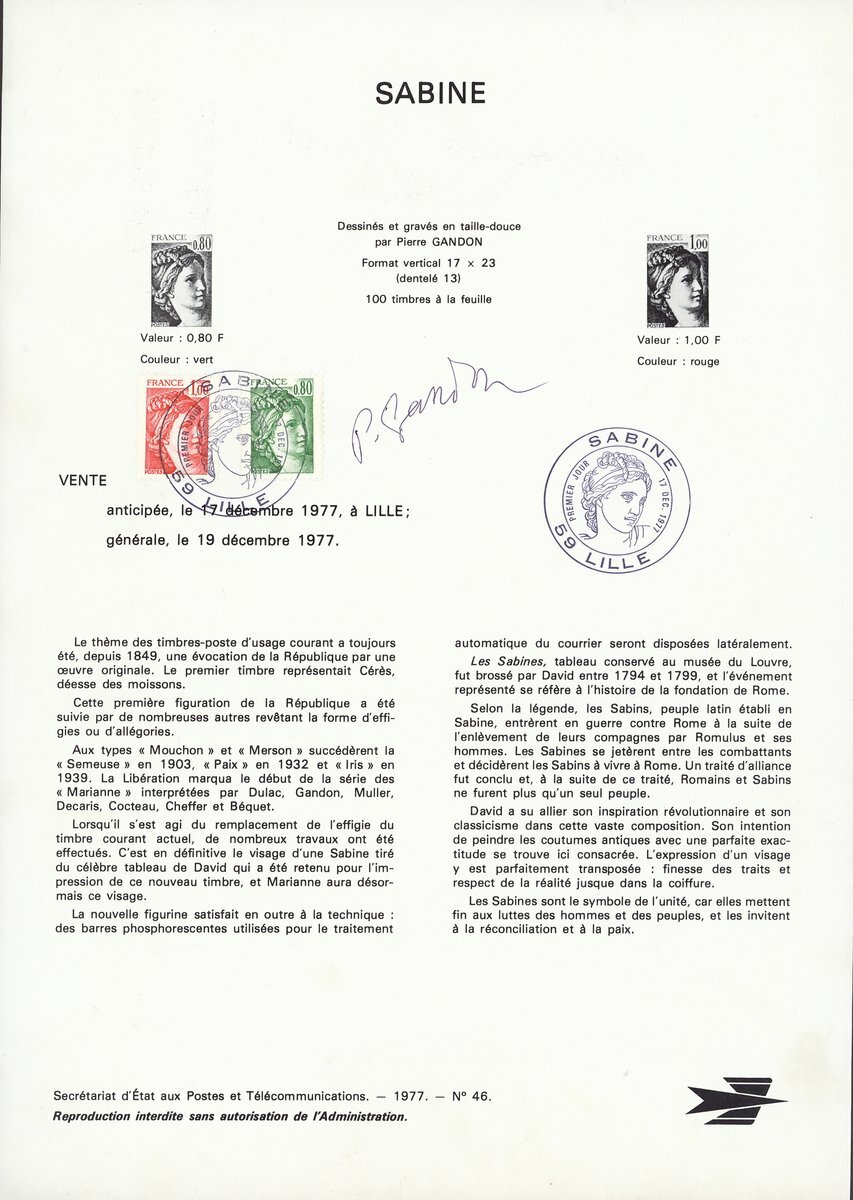 1977 1f. red and 80c. green cancelled on first day of issue (17 Dec.), tied to souvenir sheet, signed P. Gandon, the stamp engraver