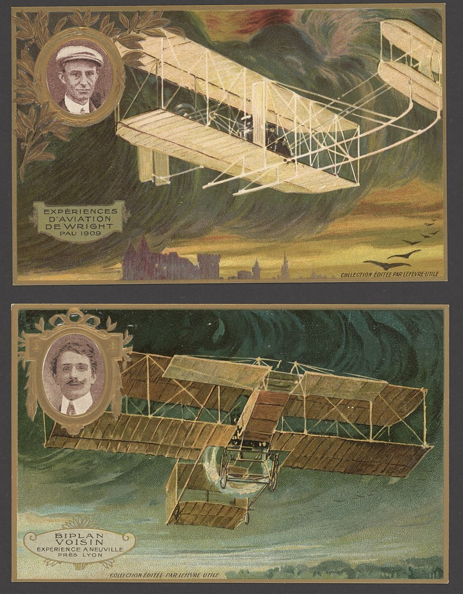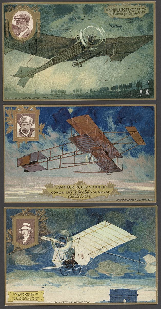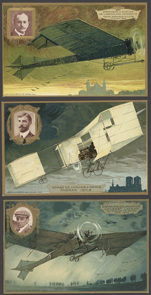 1912 Lefevre Utile Biscuit Co. postcards group of nine colourful and lightly-embossed cards depicting famed aviators and their aeroplanes, including Blériot, Glen Curtiss, Roger Sommer, Santos Dumont, etc, a visually-appealing and desirable lot, very fine .