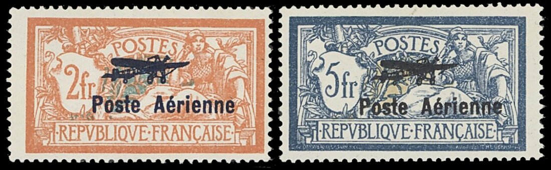 1927 2fr. 5fr. Merson overprinted "Poste Aerienne" set of two, unmounted mint the 2fr. value (pencil signed), and the very very lightly mounted the 5fr. value fresh and fine-very fine. Spink Maury 1-2, €1,100 .