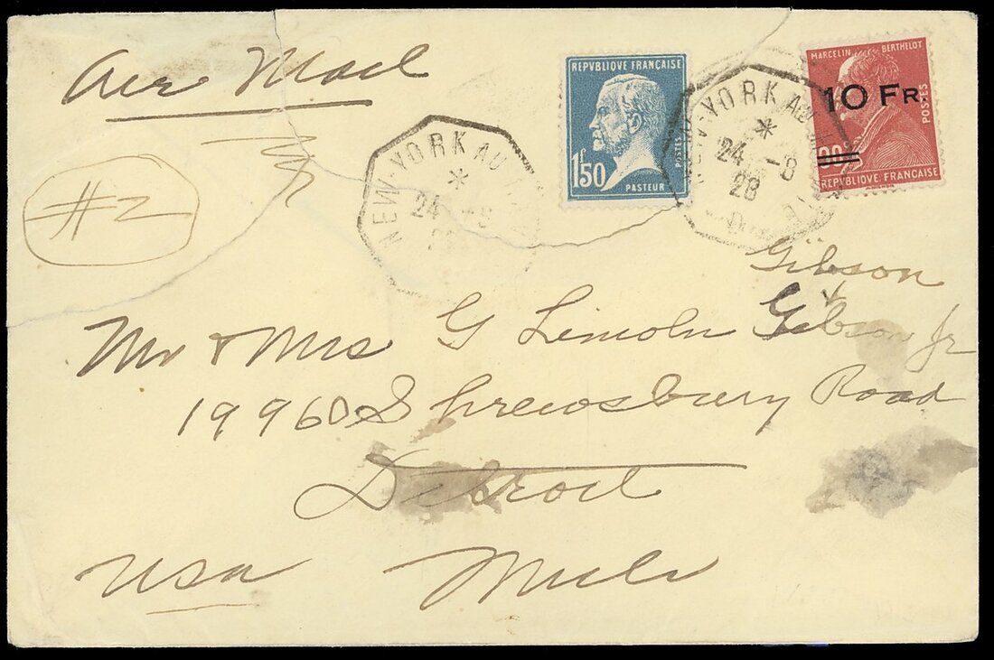 10f. on 90c. red, spaced surcharge, well centred, used with Pasteur 1f. 50 on French Line envelope to Detroit, octagonal New York au Havre cancellations of 24 Aug. 1928; the stamp with tiny corner crease at lower left and the envelope with tears; rare. Only 270 examples with the spaced surcharge can exist. Spink Maury PA3