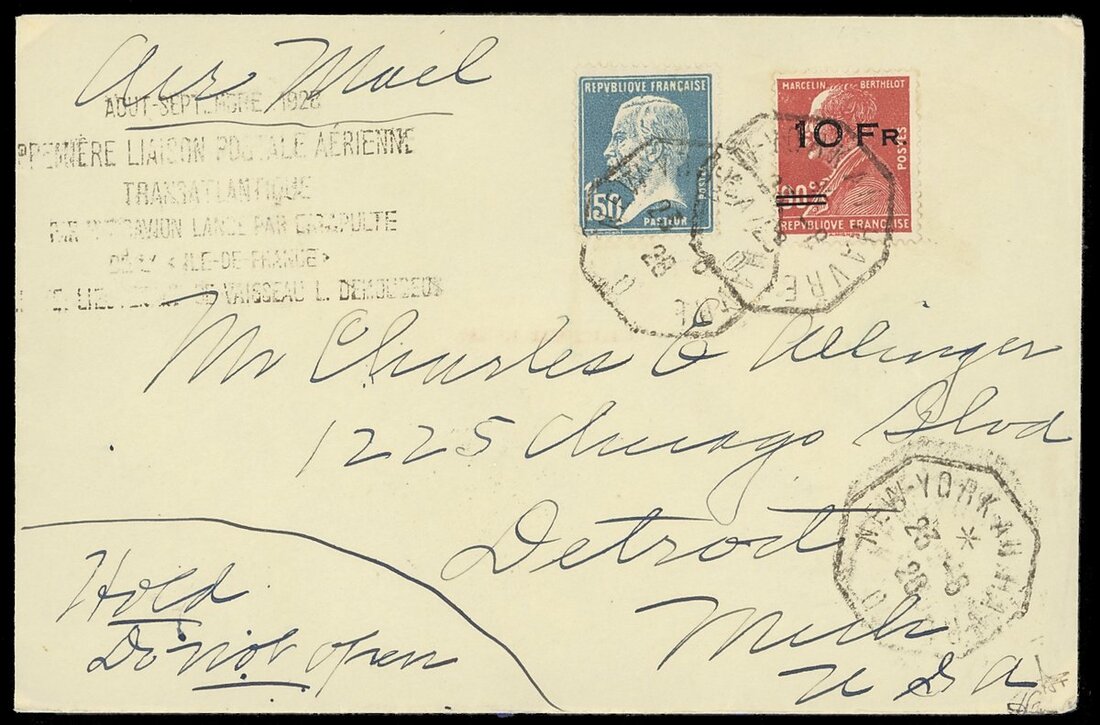 10f. on 90c. red, spaced surcharge, used with Pasteur 1f. 50 on French Line envelope to Detrioit, octagonal New York au Havre cancellations of 23 Aug. 1928, special six line cachet; fine and rare. Only 270 examples with the spaced surcharge can exist. Spink Maury PA3