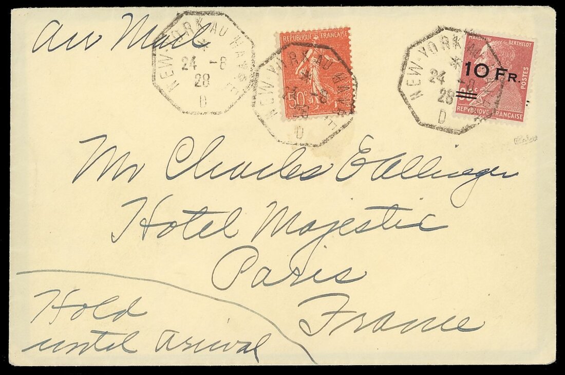 10c. on 90c. red, used with Sower 50c. on French Line envelope, with S.S. Ile de France enclosure, to Paris, octagonal New York au Havre cancellations of 24 Aug. 1928, well centred, fine. Spink Maury PA3