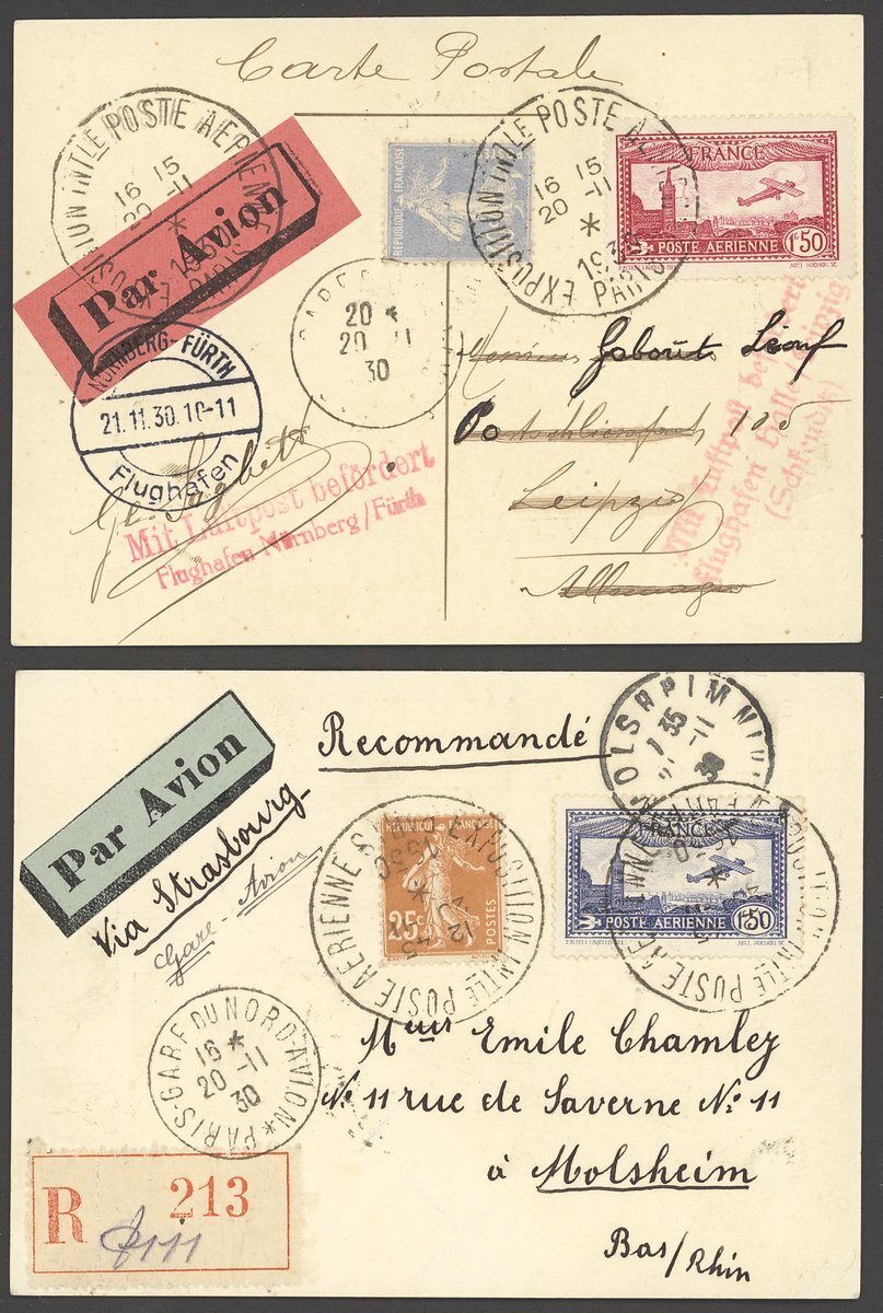1f. 50 carmine with Sower 40c. on reverse of souvenir card (green border) with carmine vignette on the front, also 1f. 50 ultramarine with Sower 25c. on reverse of souvenir card (orange border) with green vignette on the front; fine