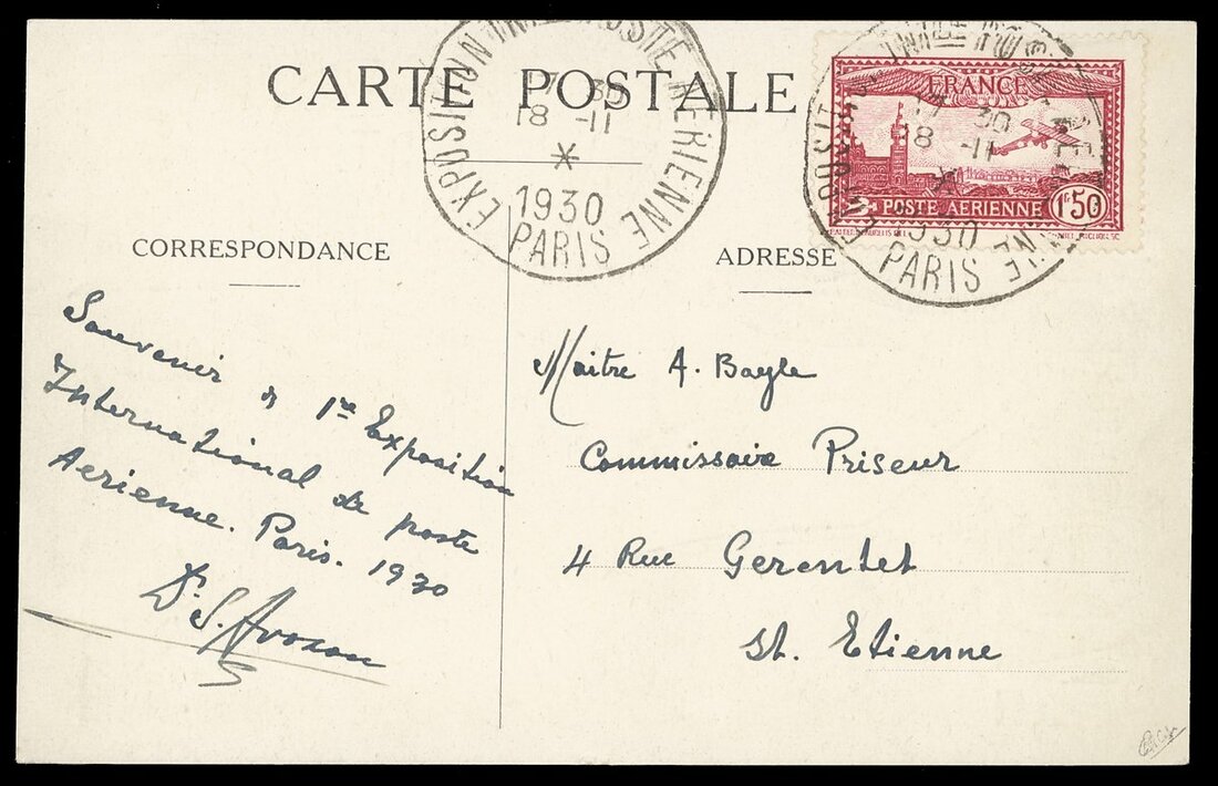 1f. 50 carmine, tied to "L'Aeronautique et L'Art" souvenir card to St. Etienne by Exposition cancellation of 18 Nov. 1930; superb. Calves Certificate (1995). Spink Maury PA 5A, €5,000