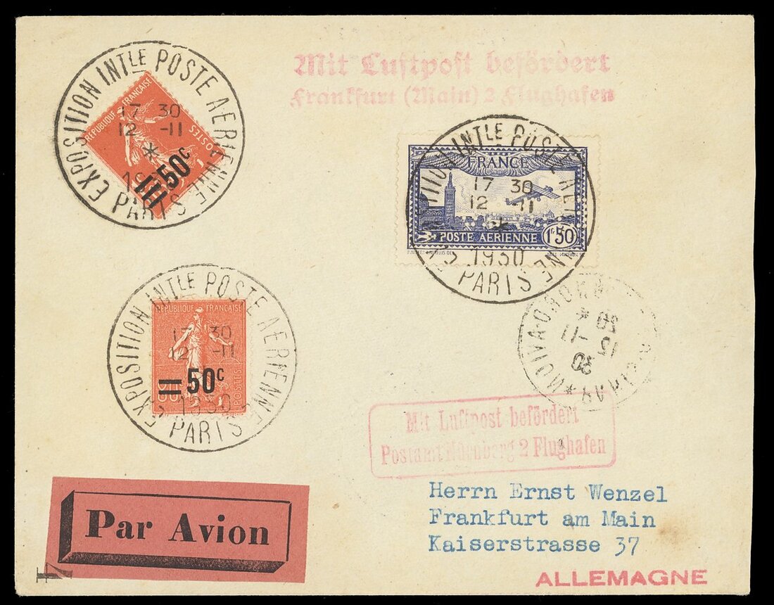 1f. 50 ultramarine (perfin inverted), with Sower 50c. on 80c. and 50c. on 1f. 05 on envelope to Germany, Exposition cancellations; the envelope with small stain, fine. Spink Maury PA 6A