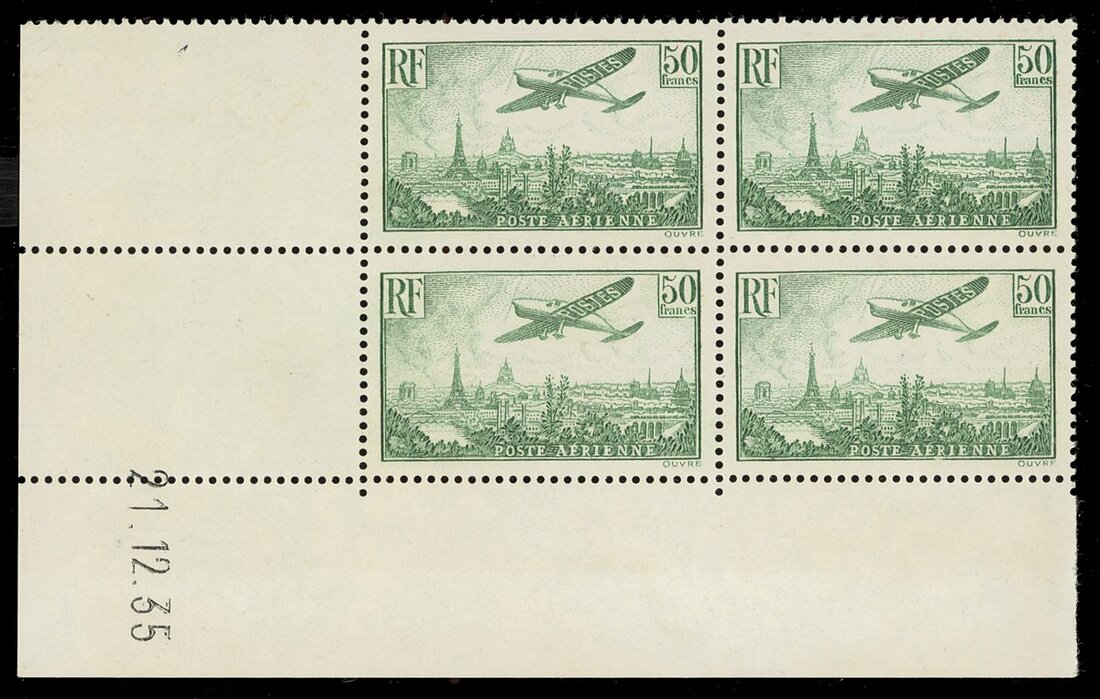 50f. yellow-green, Coin daté (21.12.35) block of four from the lower left corner of the sheet; unmounted mint, tiny wrinkles, very fine. A rare and desirable block. Spink Maury PA 14, €11,000