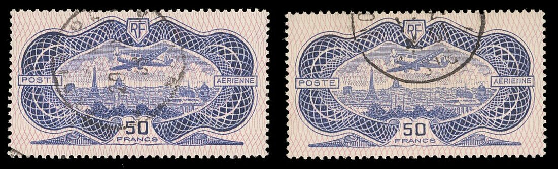 50f. ultramarine and rose, two used examples each with part c.d.s., fine. Spink Maury 15, €770, S.G. 541, £950