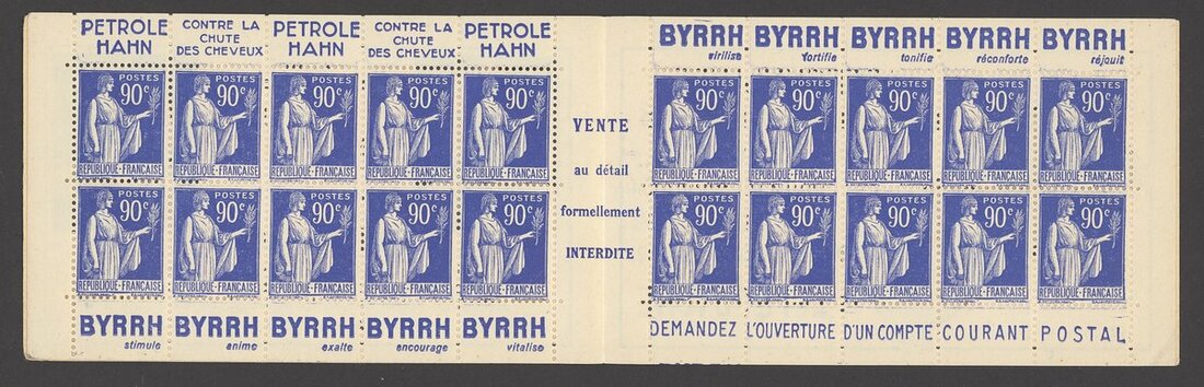 18f. Peace booklet, series 52, containing two panes of ten 90c. with "Hahn-Byrrh-Byrrh-C.C.P." Pubs; unmounted mint; fine. Spink Maury 243, €200