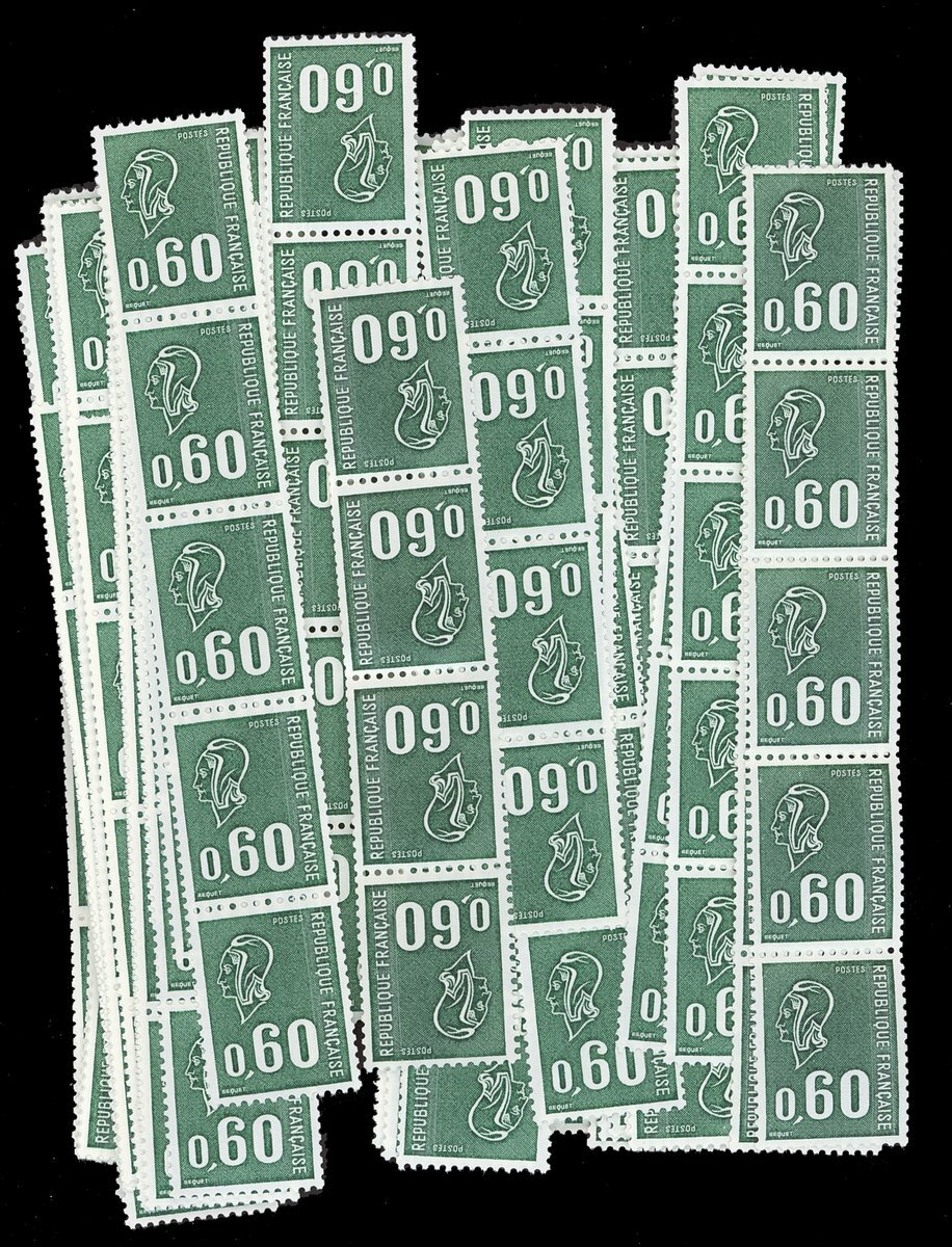 1969 30c. green roulette stamps (c. 50+) all with red numbers on reverse and 1974 60c. green in roulette strips of four and five (c.100+) Spink Maury R1536A and R1808-3, €1,000+