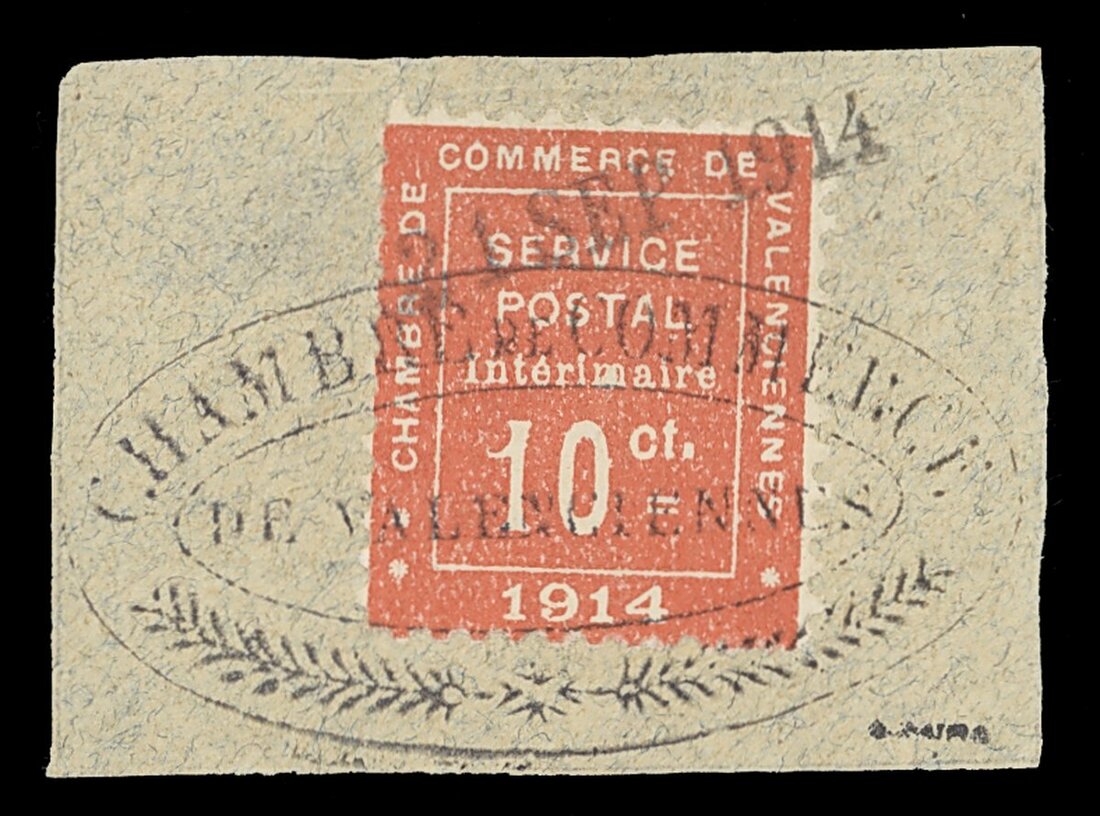 1914 "Chamber de Commerce de Valenciennes", 10c red, tied to piece by oval violet "Chambre de Commerce Valenciennes" and straight-line "21 SEP 1914" datestamp, recorded used only between 8 September to 30 October 1914, scarce and fine. Spink Maury 1, €540