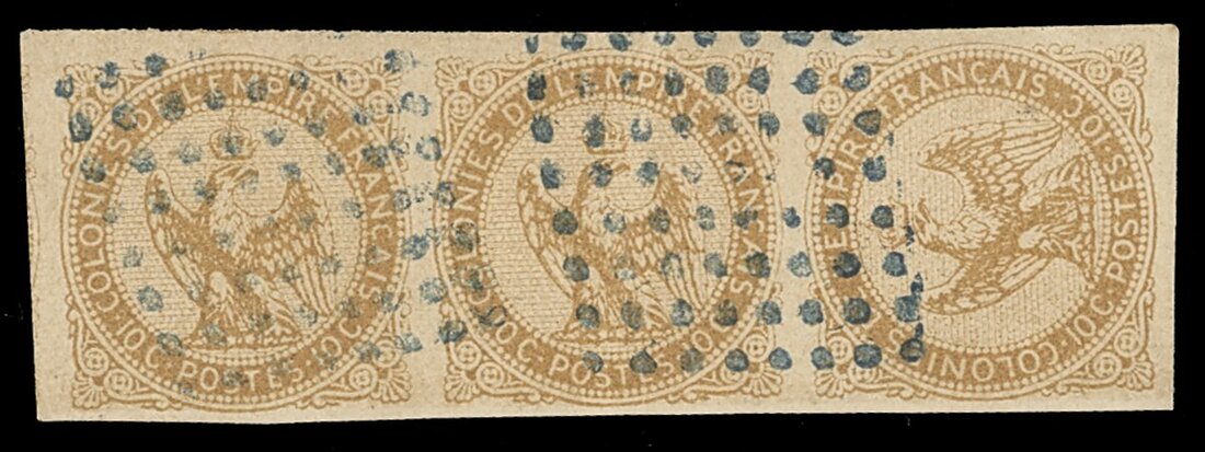 1859-70 10c. bistre strip of three, third stamp with variety turned sideways with top to left, cancelled by diamond of dots cancellations, fine and scarce. S.G. 3a, £650+