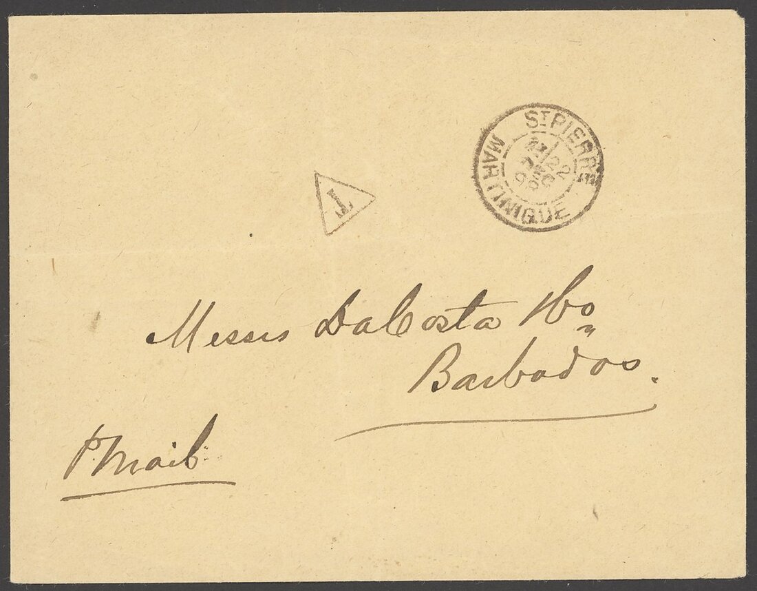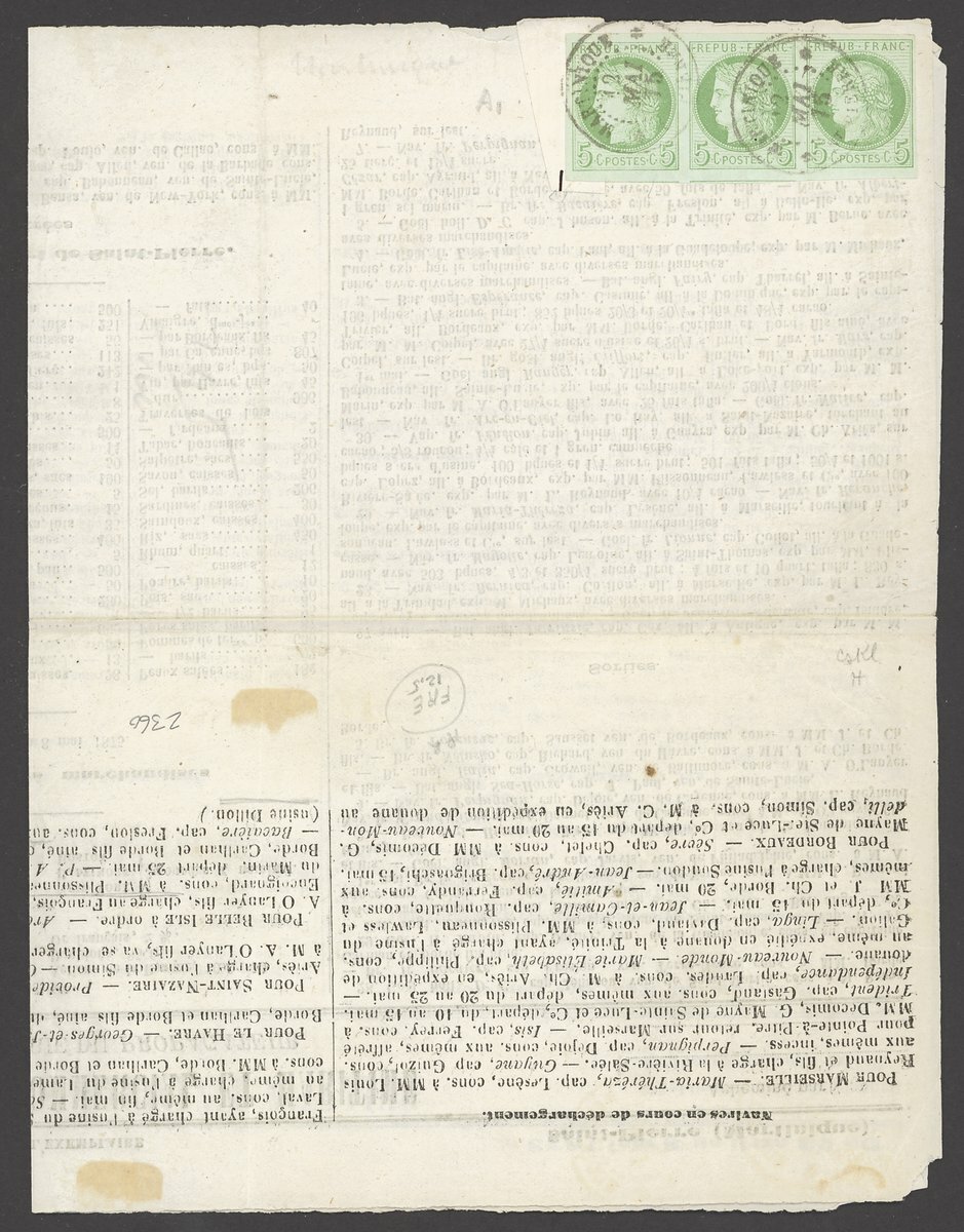 1875 (12 May) printed "Bulletin Commercial, Financier et Maritime" from St. Pierre bearing Ceres 5c. strip of three with good margins and despatch c.d.s. A very rare 15c. rate paying a newspaper internally. Maury 17. Also 1898 (22 Dec.) unsealed stampless envelope (creases) from St. Pierre to Barbados, showing despatch c.d.s. and
