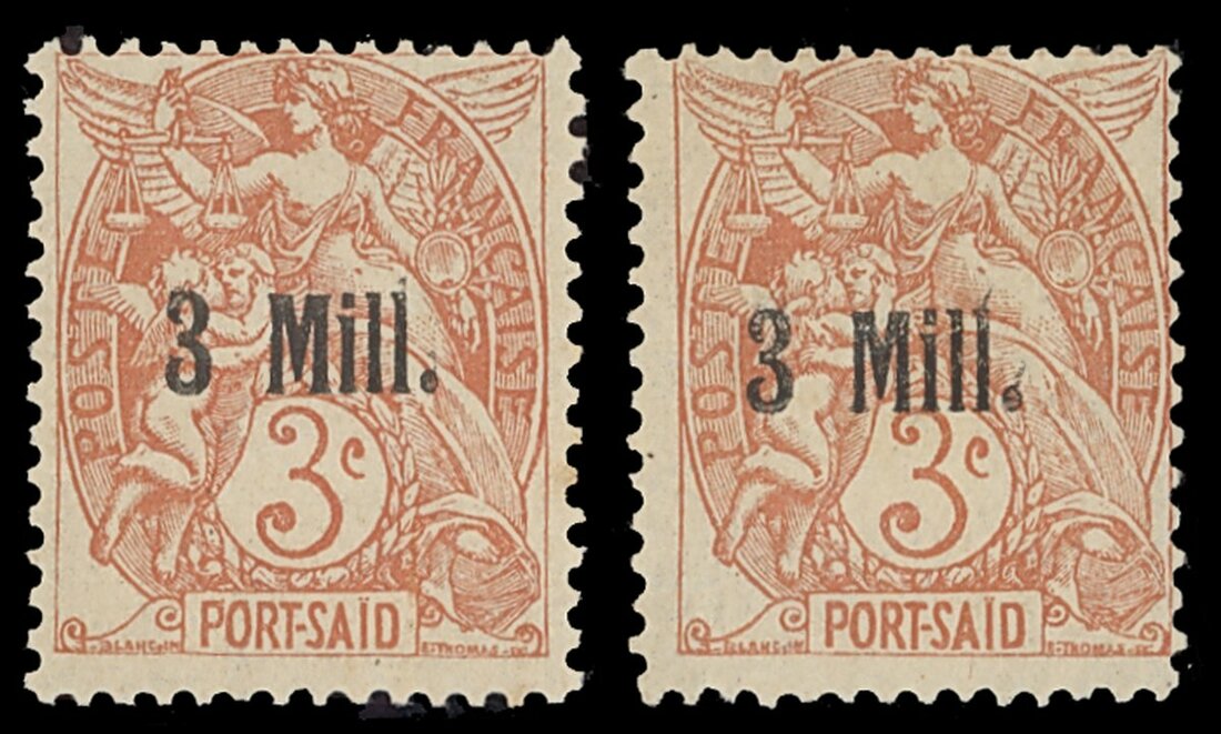 3m. on 3c. orange stamp of Port Said, two examples with large part original gum. Yvert 36b, €350