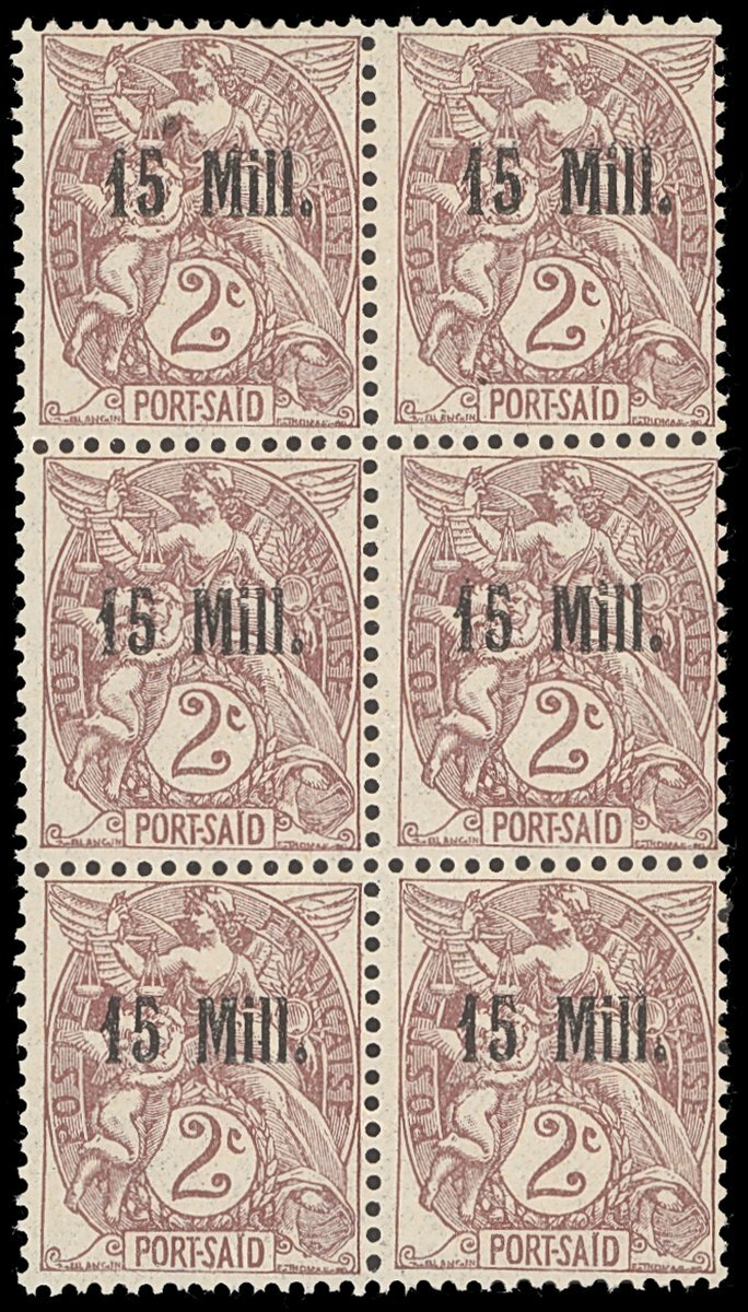 1921-23 15m. on 2c. brown-lilac error of surcharge, surcharged on Port Said stamp P> block of six (2x3) mint (five stamps unmounted, mounted in the upper right stamp only, fine and scarce, Yvert 44a, €1,020++