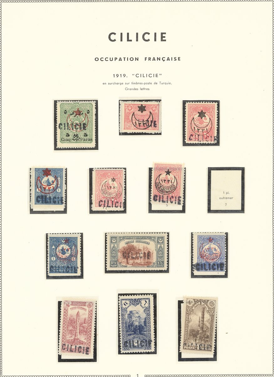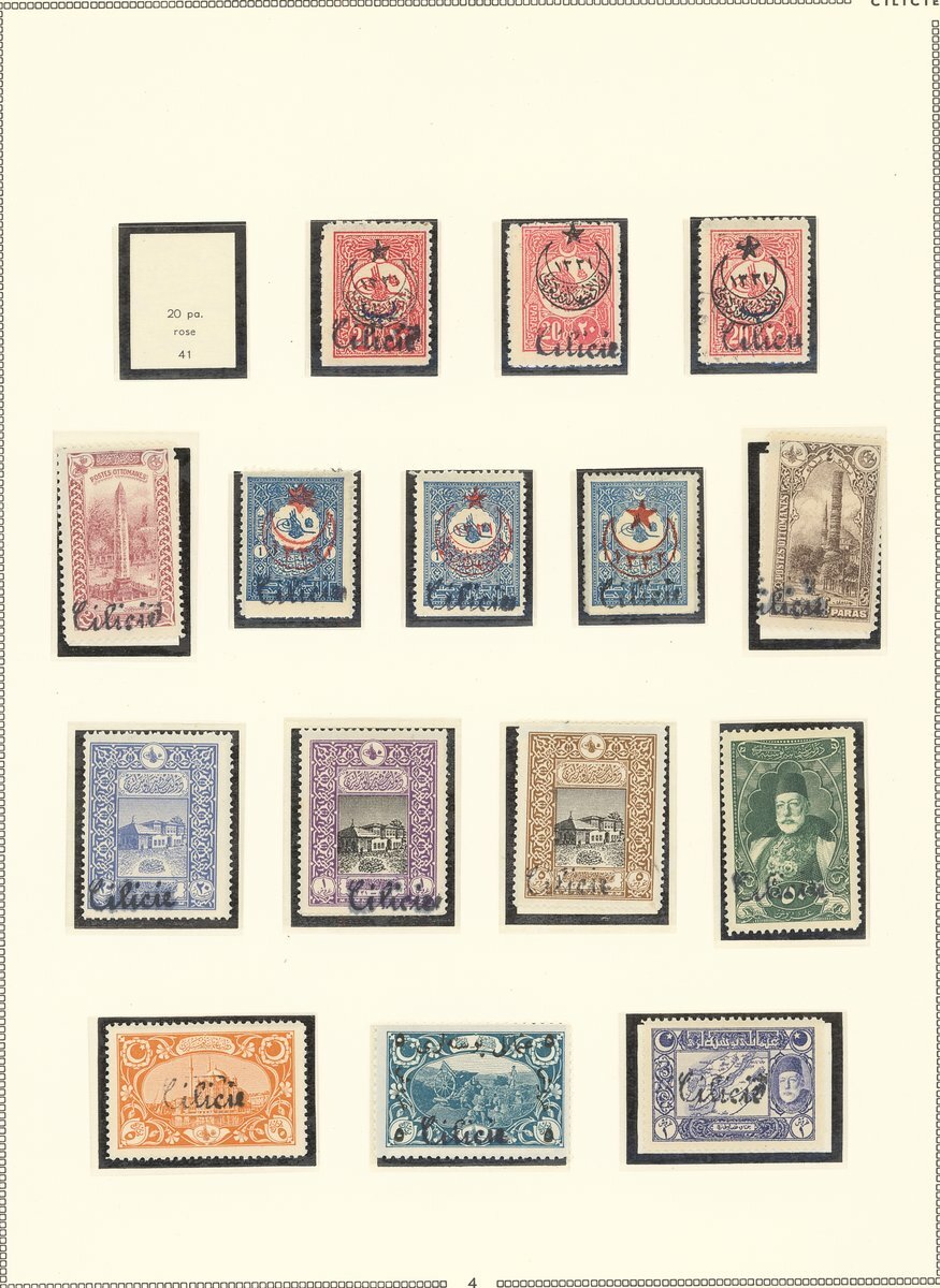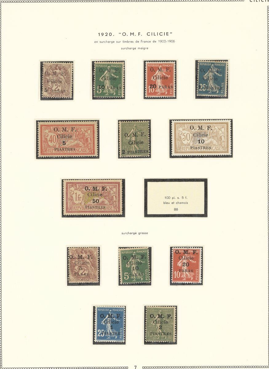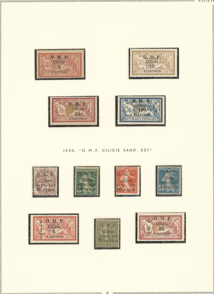 1919-20 mint collection on album pages including 1919 5pa. green with Type 1 overprint, 1919 20pa. rose-carmine with Types 2 and C overprint, 1919 1pi. dull blue with Types 3 and E overprints and 50pi. green on yellow, 1920 'O.M.F. Cilicie' Type 9 surcharges to 50pi. on 1f. and 1920 larger letter surcharge set to 100pi. on 5f., 1920 'O.M.F. Cilicie Sand. Est.' set to 20pi. on 1f., Postage Dues, etc., Cat. £1,500+