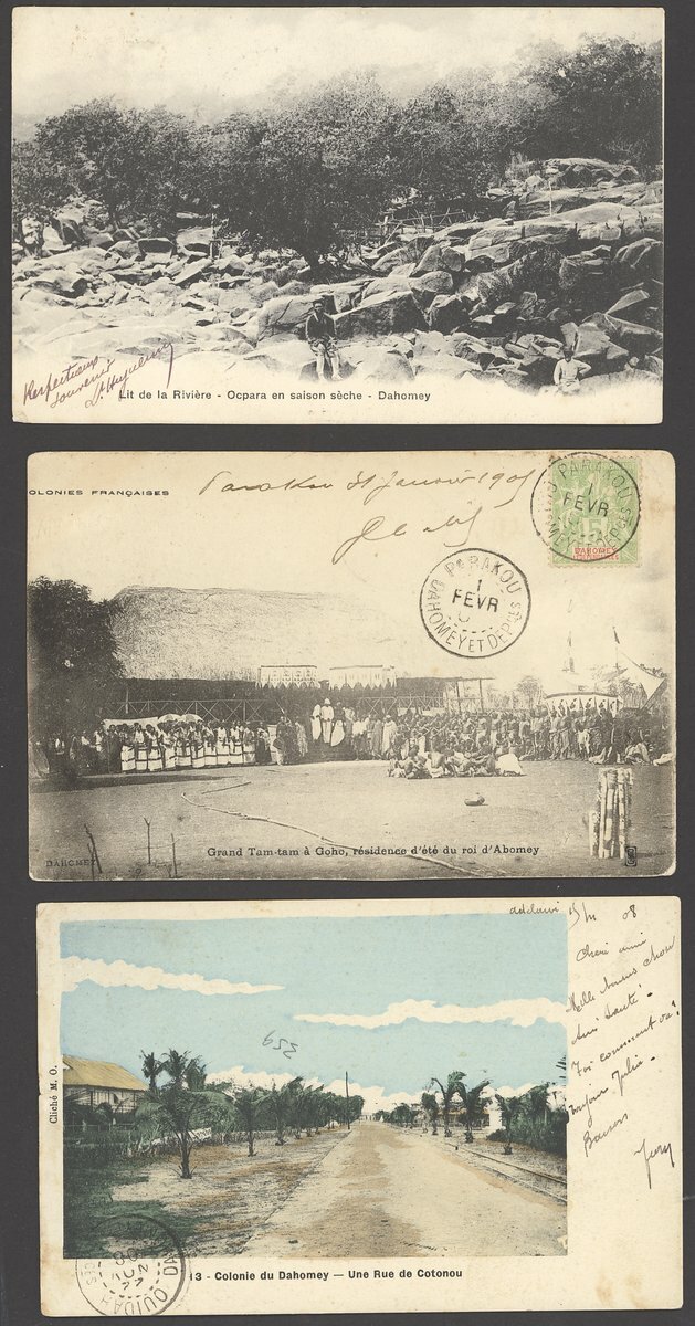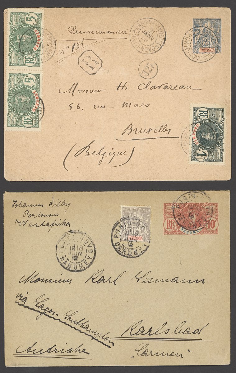 1893-1912 Postal History selection (13) including five Picture Post Cards comprising Carimama 1906 to France, Paouignan 1905 to France, Parahoue 1908 to Switzerland, Parakou 1905 to Belgium, Save 1910 to Paris; selection of seven Postal Stationery; and a 1894 (4 Nov.) stampless envelope to Paris, endorsed Correspondence Militaire with Zagnando/Dahomey, Correspce Militaire/Porto-Nove-Benin datestamps, on reverse Military cachet, transit and arrival datestamps. An interesting group .
