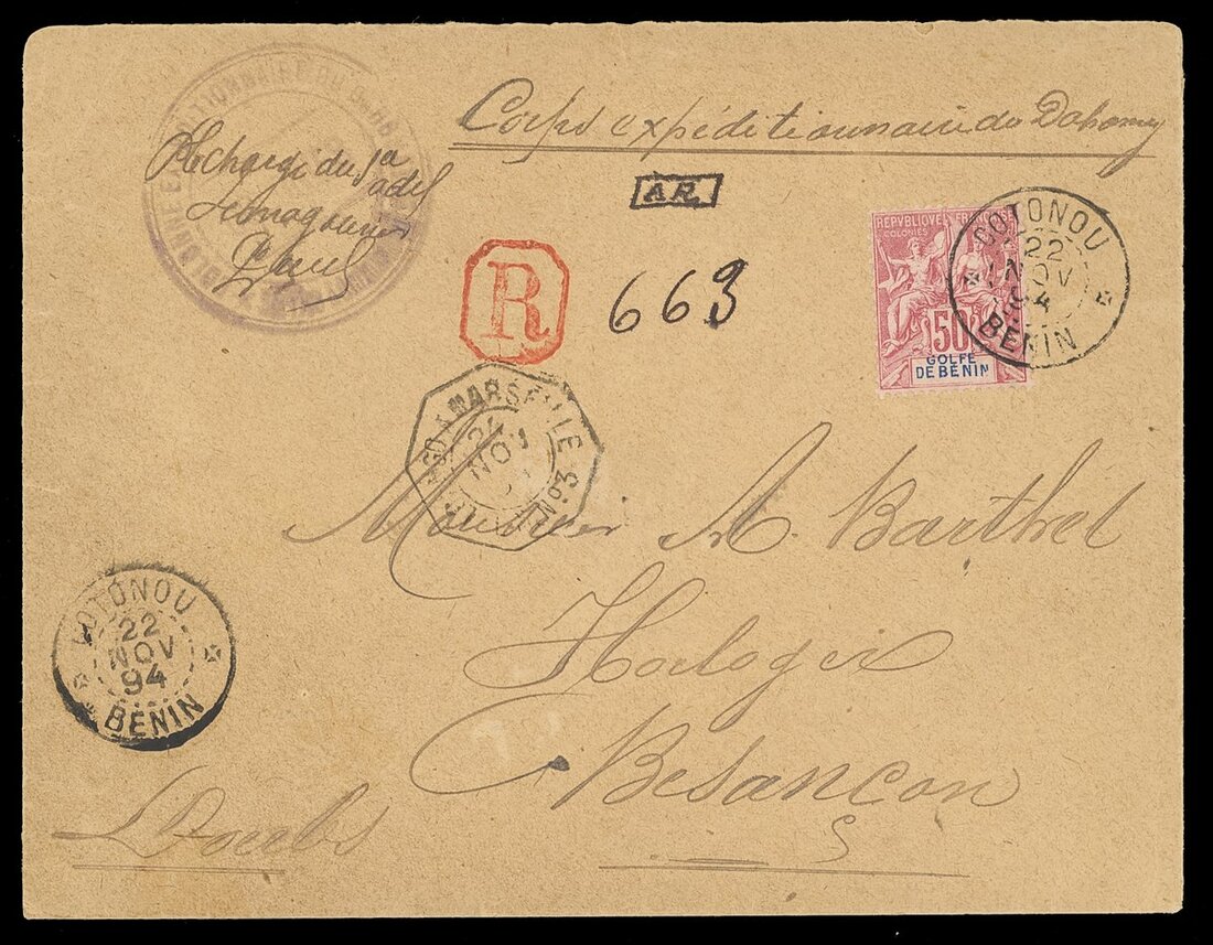 1894 (22 Nov.) envelope endorsed Corps expeditionaire du Dahomey A.R. registered to Besancon franked Golfe de Benin 50c. with Cotonou/Benin dotted circle cancellation, octagonal Loango a Marseille/L.V. No. 3 alongside and Military cachet on front and reverse, arrival datestamp on the reverse; fine and very scarce .