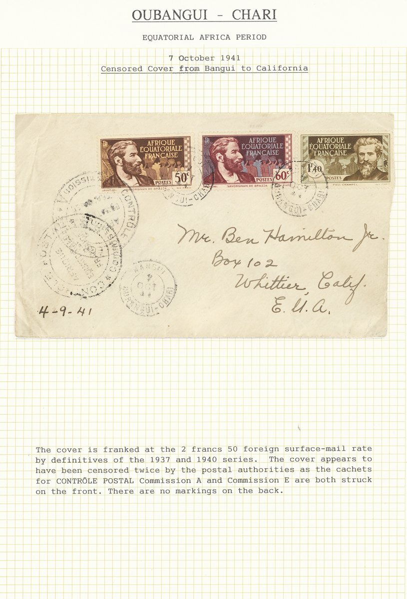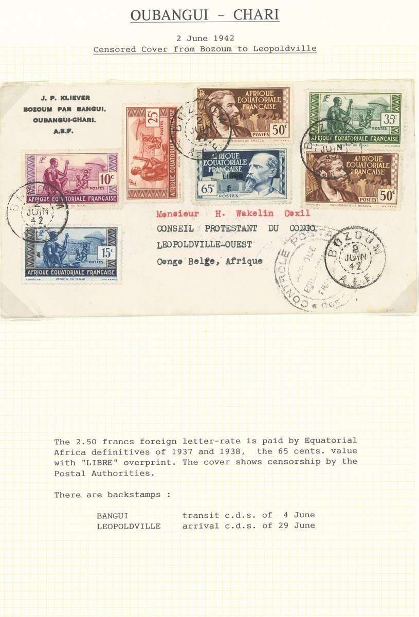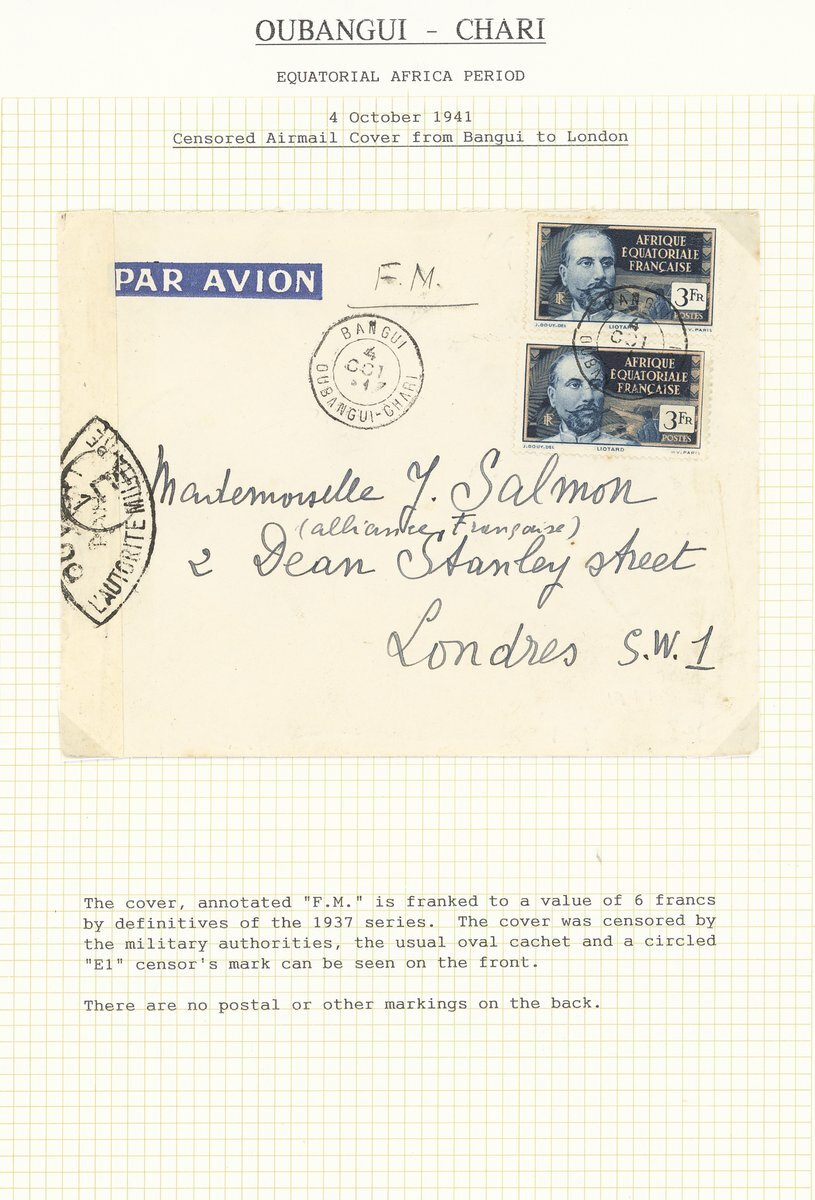 1937-52 Postal History selection of eighteen covers/cards arranged on well written up pages including 1939 bearing 90c.+35. "Bastille" solo franking, 1943 rare POW unfranked cover from Fort Lamy addressed to Italy ,censored three times during its five months journey before being delivered!; 1944 cover to Brazzaville bearing complete "Resistance" set of fourteen. A fascinating group .