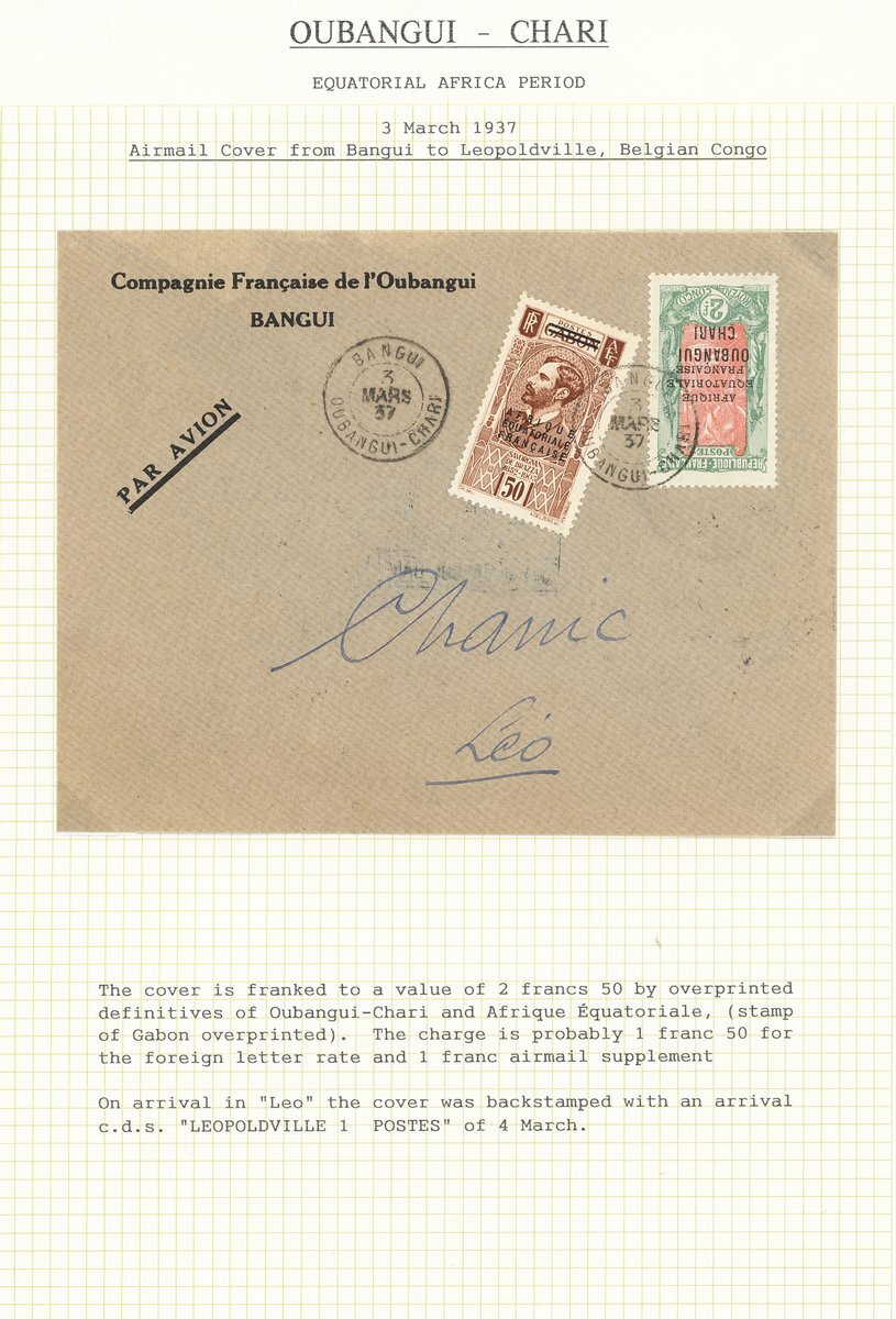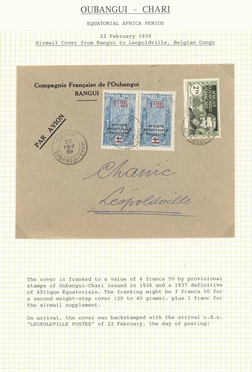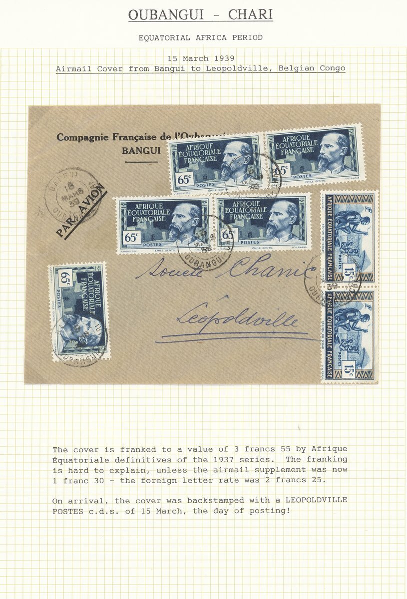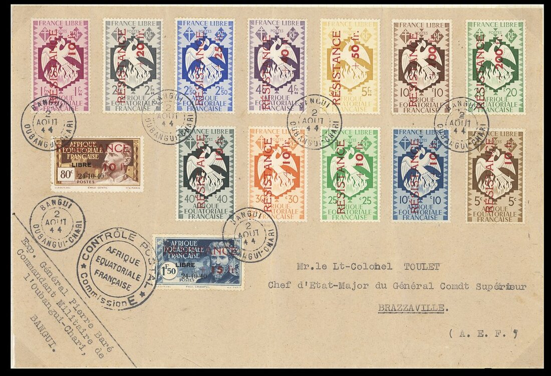 1937-52 Postal History selection of eighteen covers/cards arranged on well written up pages including 1939 bearing 90c.+35. "Bastille" solo franking, 1943 rare POW unfranked cover from Fort Lamy addressed to Italy ,censored three times during its five months journey before being delivered!; 1944 cover to Brazzaville bearing complete "Resistance" set of fourteen. A fascinating group .