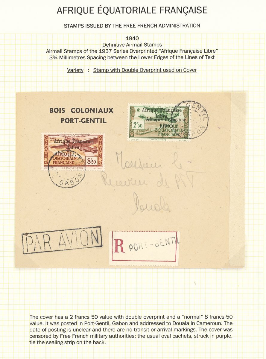 1940 registered air mail cover from Port-Gentil addressed to Douala franked with 1940 "Afrique Française Libre" Air 2f.50 showing variety "overprint double" and 8f.50, stamps cancelled by "Port-Gentil" date stamp with unclear date, cover was censored and cacheted with the usual oval markings in purple. Very fine and very rare, only one sheet of fifty was printed with the double overprint. S.G. 156a, 160. Photo