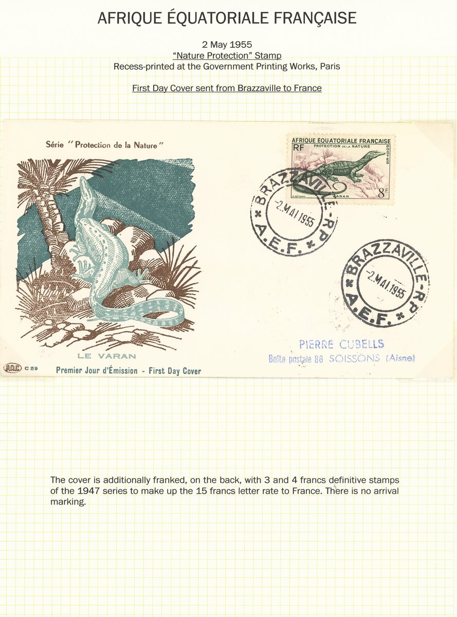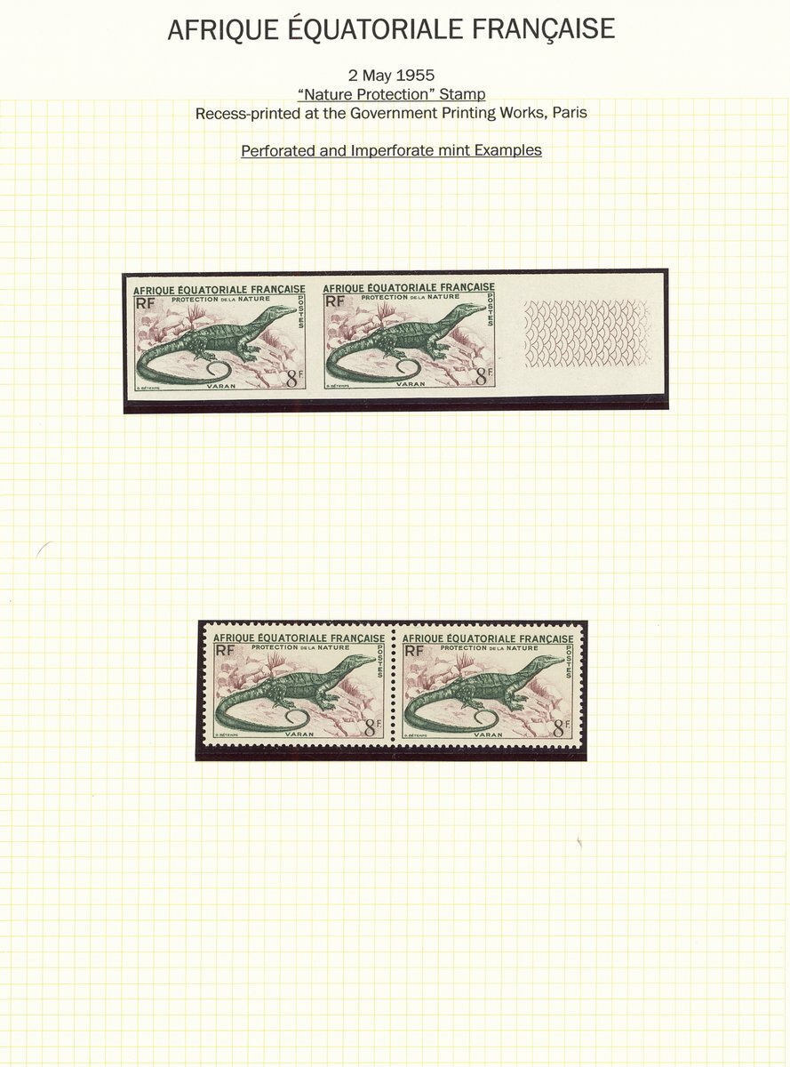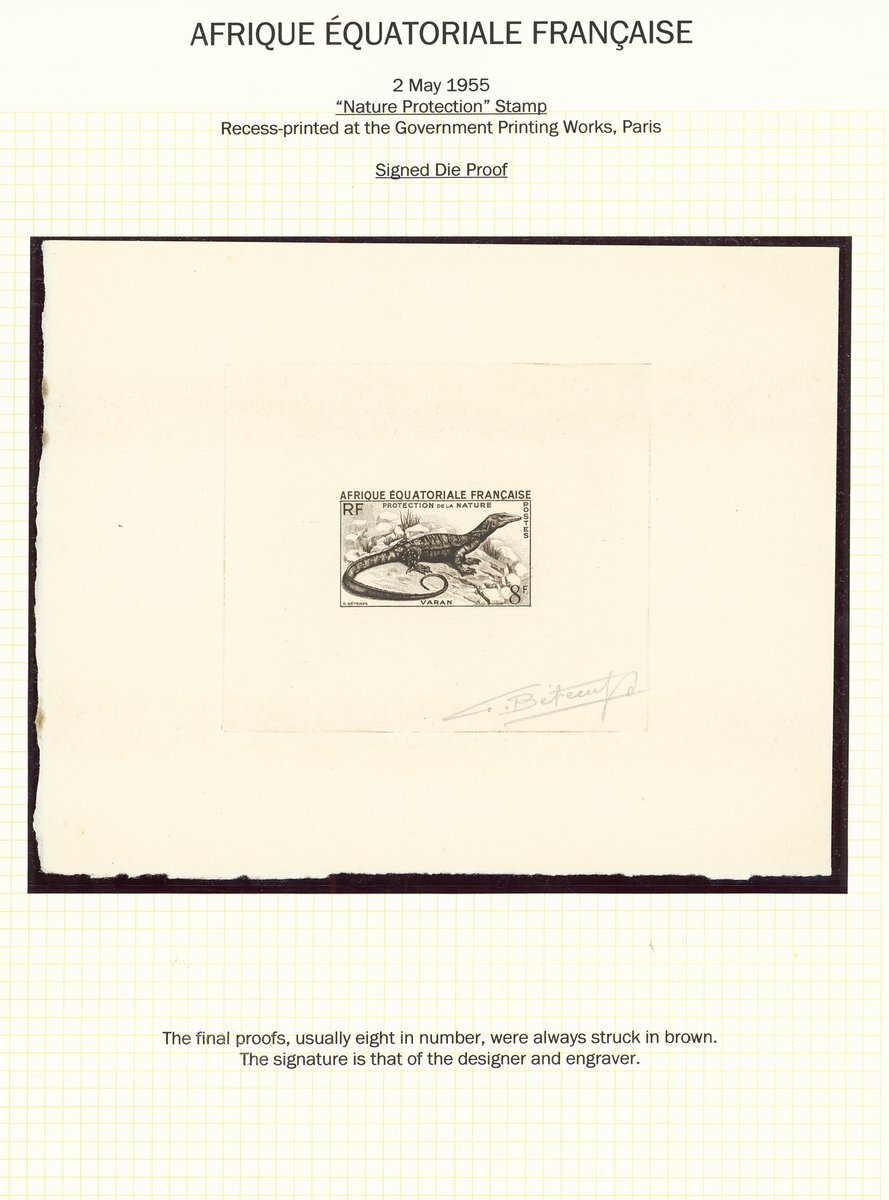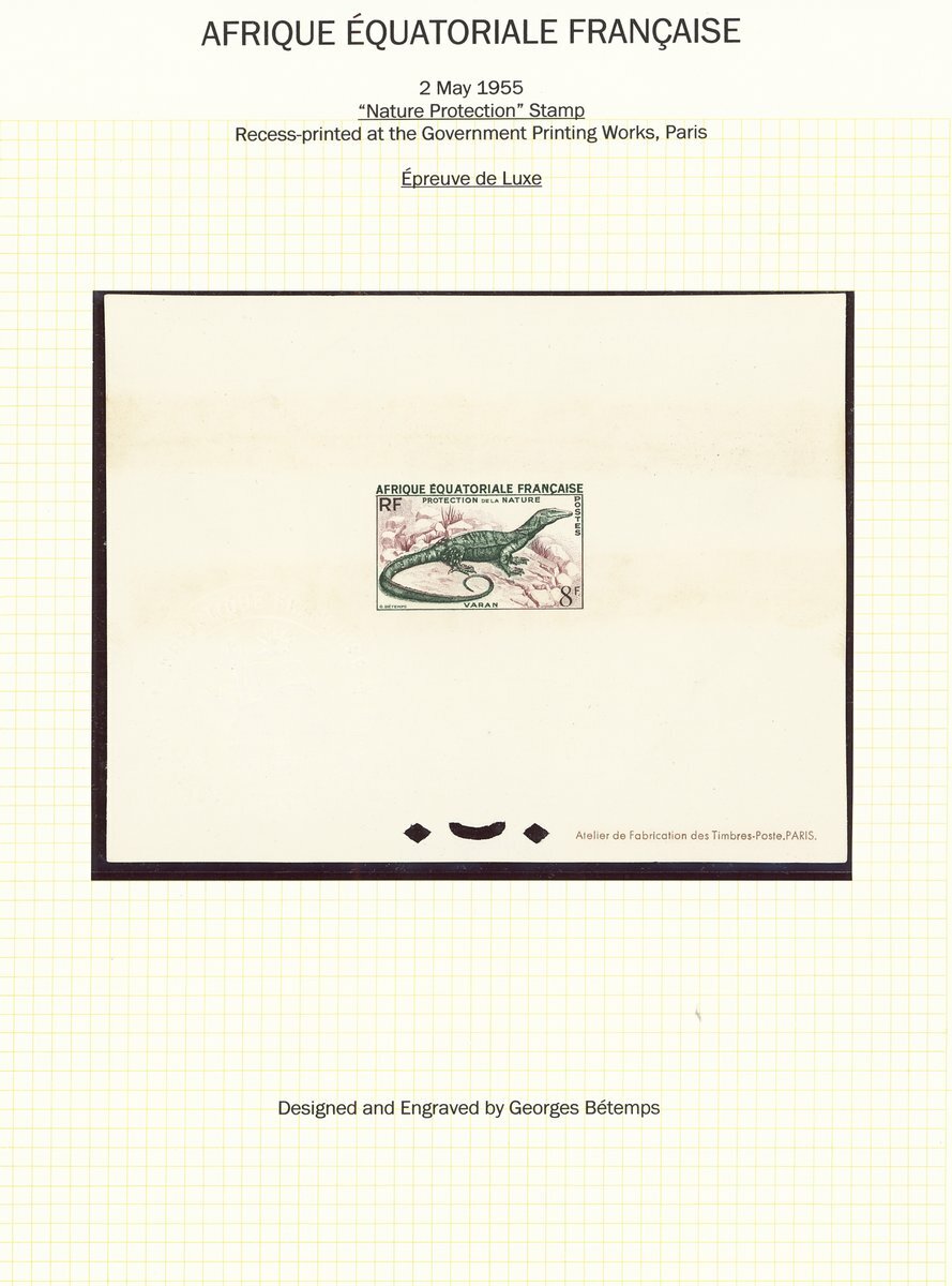 1955 "Nature Protection" 8f. issue study including Die Proof in brown signed by G. Bétemps, Épreuves de Luxe signed by G. Bétemps, unmounted horizontal pairs (perforated and imperforated), and a First Day Cover, generally fine .