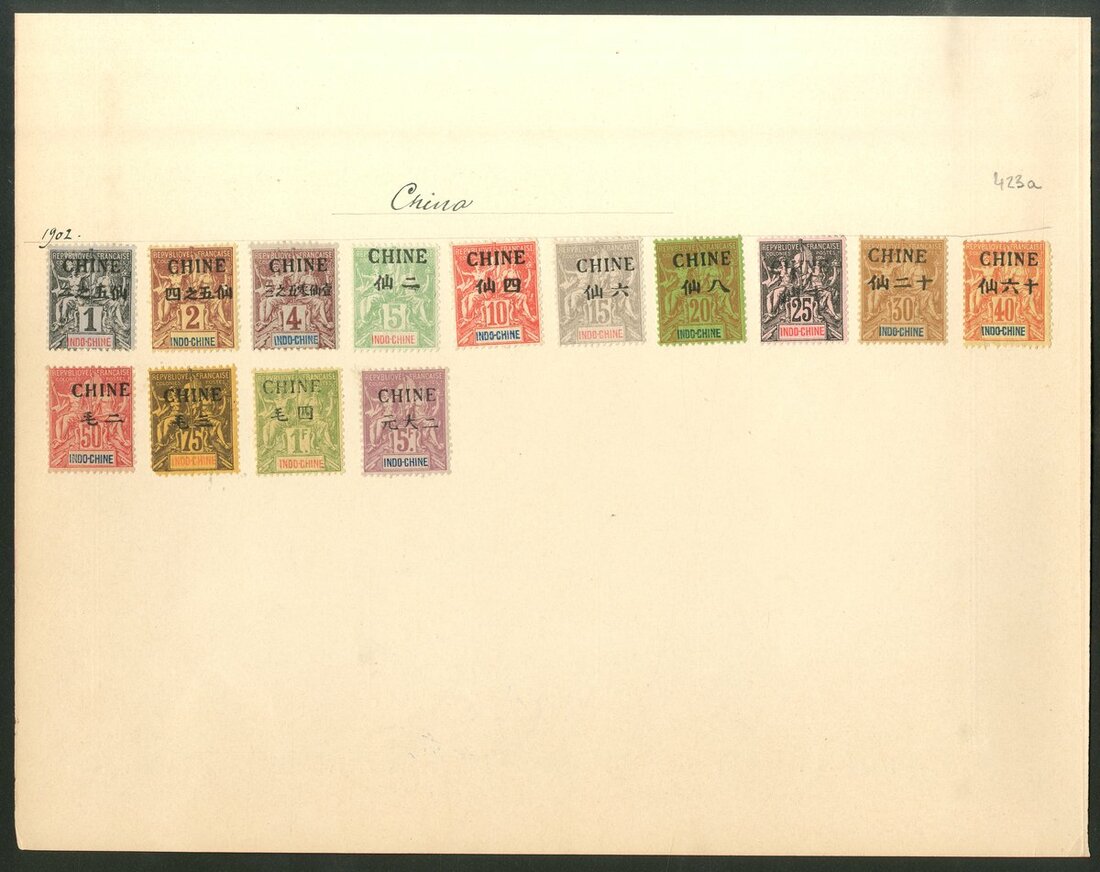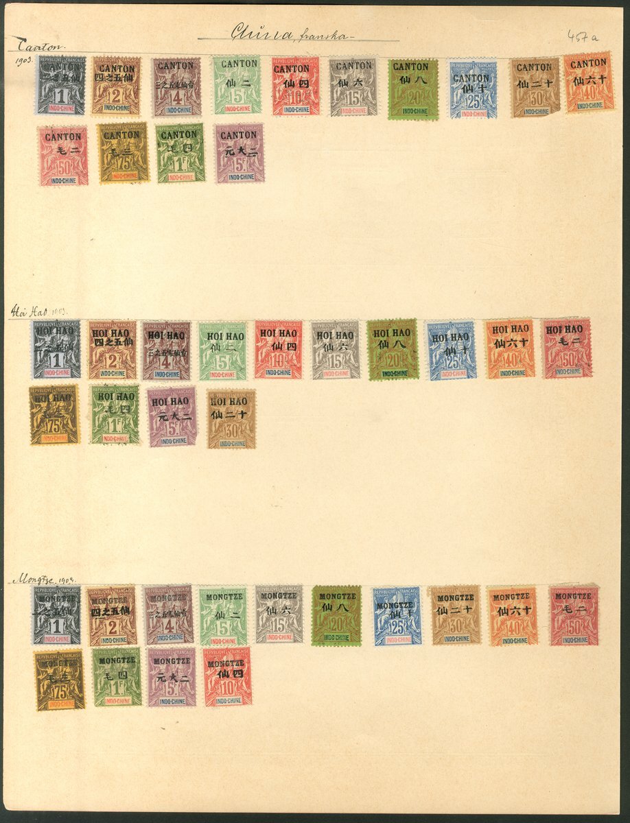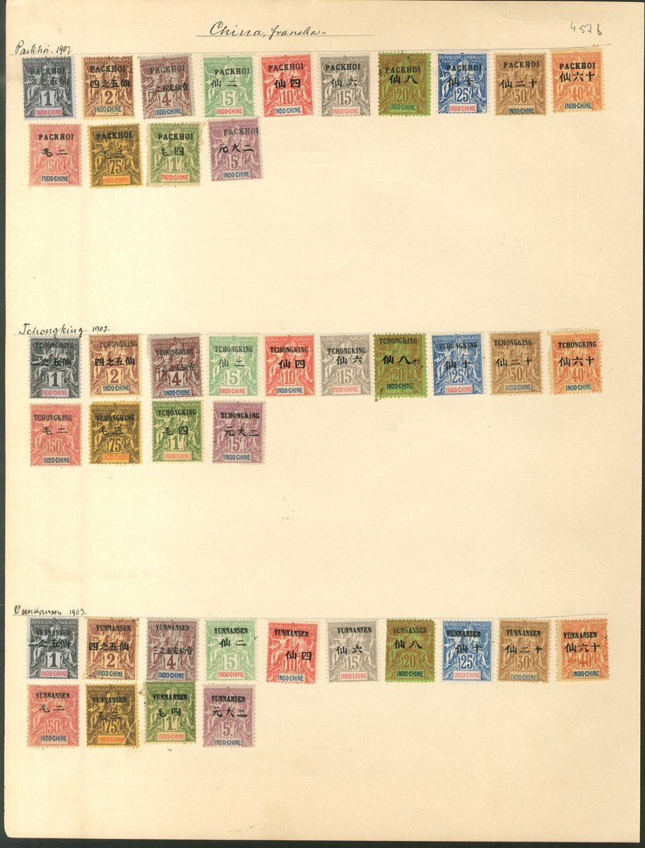 1902-03 Indo-Chinese Post Offices in China mint collection from the Royal Swedish General Post Office UPU collection arranged on pages with values mostly stuck to pages but with brilliant original colours, including set of fourteen for: General issue 1902 to 5f., Canton 1903 to 5f., Hoi Hao 1903 to 5f., Mongtze 1903 to 5f., Packhoi 1903 to 5f., Tchongking 1903 to 5f., Yunnansen 1903 to 5f., a charming philatelic ensemble. Photo