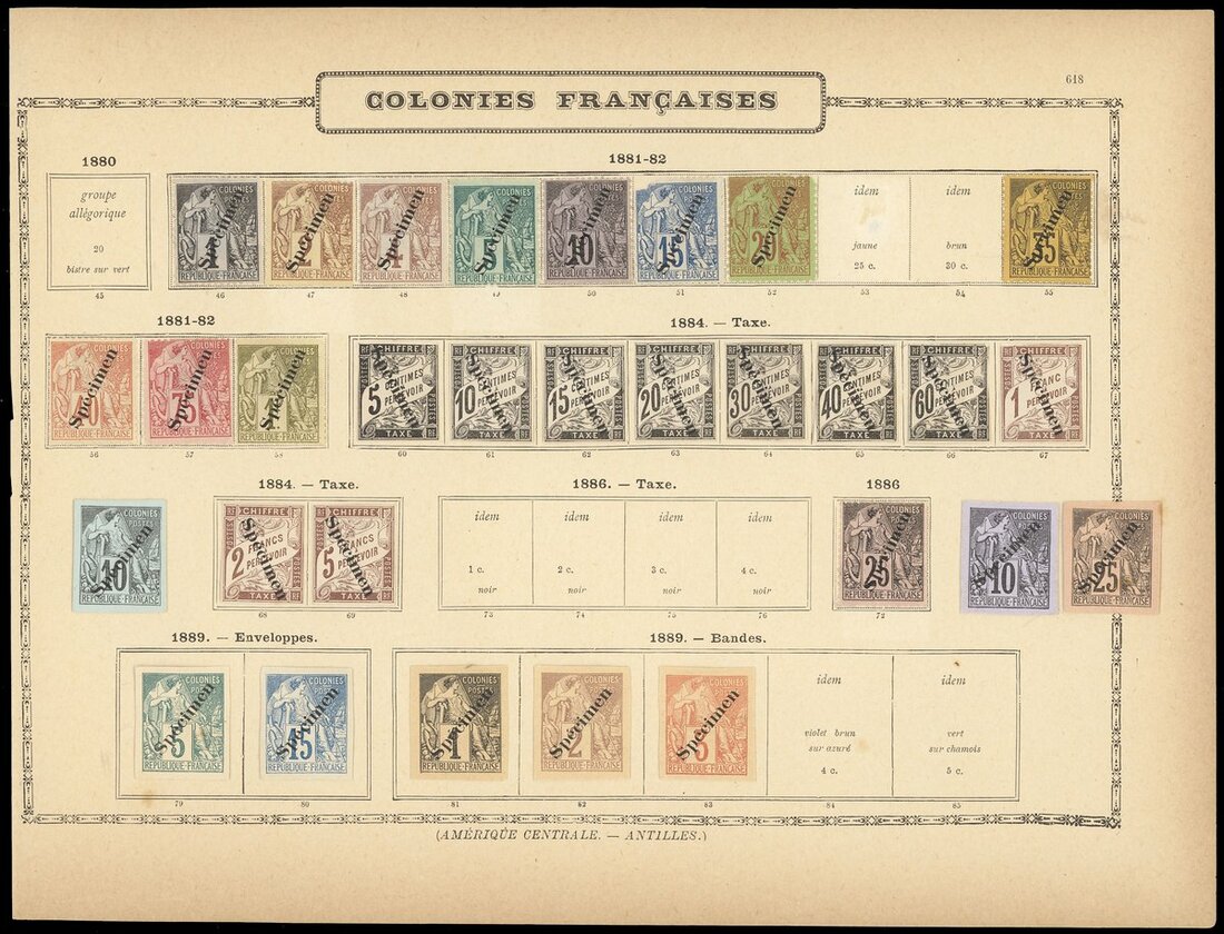Page believed to be from a ca. 1903 Maury album with hinged adhesives and postal stationery cut-outs available in 1889, all overprinted "SPECIMEN" and issued by the Post and Telegraph Administration of Indo-China. Stamps and stationery cut-outs are from the General issues with 1881-86 1c. to 20c. and 35c. to 1f., and postage due 1884 5c. to 5f.; stationery cut-outs with eight different types. Condition mixed as usual nevertheless a very difficult ensemble to obtain. Photo