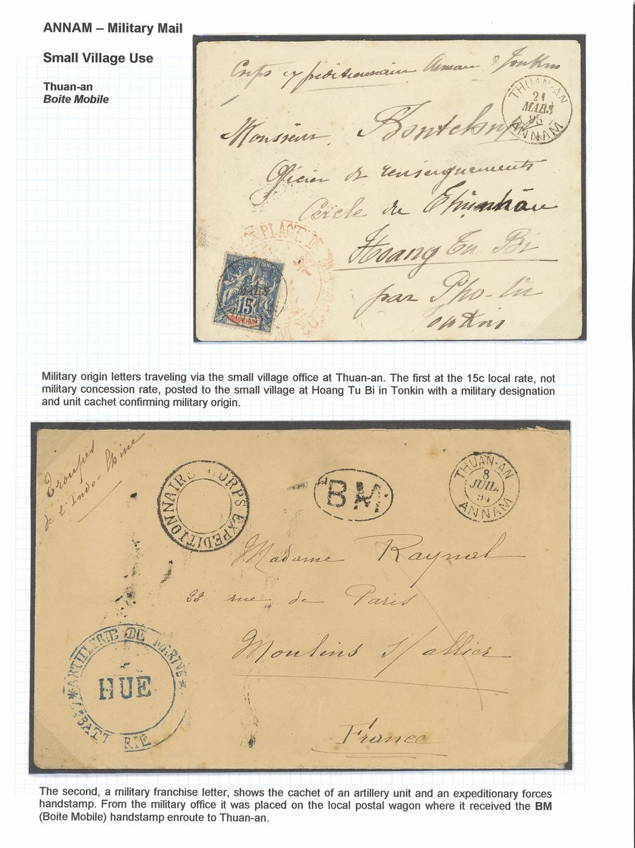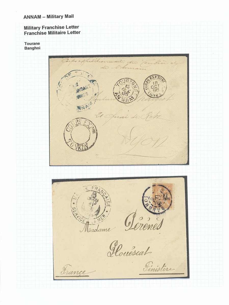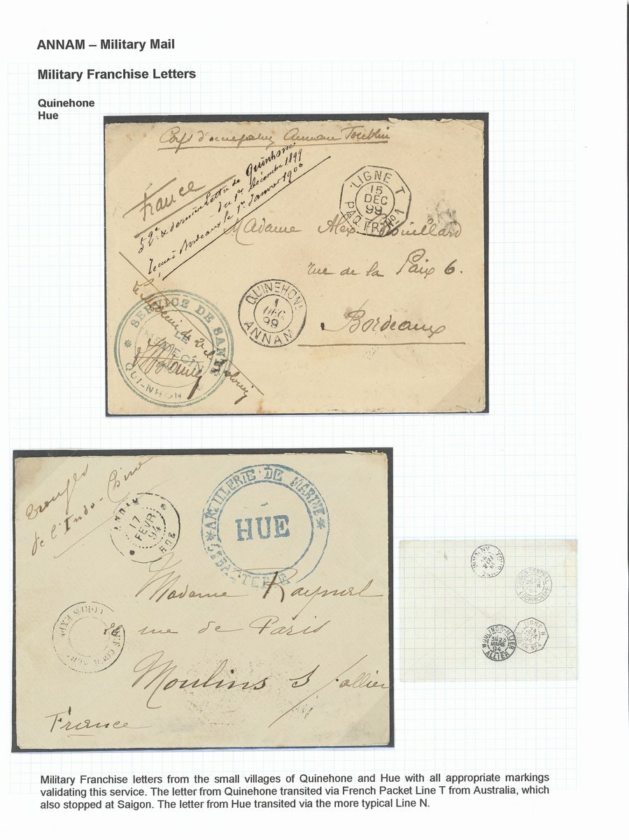 Military Franchise 1894-1905, six covers, origins with Banghoi, Hue, Quinhone, Thuan-an 1894 with oval