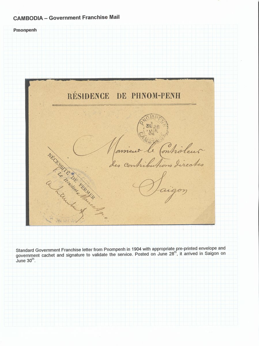 1894-1905 trio including 1904 (28 June) stampless Official envelope to Saigon with Pnompenh/Cambodge cancellation, arrival datestamp and official cachet on reverse; 1894 (26 Nov.) 5c. postal stationery envelope to Paris with Pursat/Cambodge dotted circle cancellation, transit datestamp on reverse; 1905 (8 June) envelope registered to Auzon franked 40c. with Pursat/Cambodge cancellation, transit and arrival markings on the reverse.