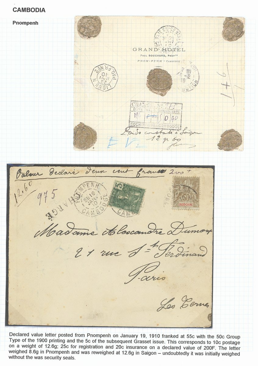 Pnompenh 1910 (19 Jan.) declared value (200Fr.) letter to Paris franked 50c. and Grasset 5c., Pnompenh/Cambodge dotted circle cancellation, unusual gold wax seals, declared valued cachet, transit and arrival markings on reverse; a few minute stain spots; fine