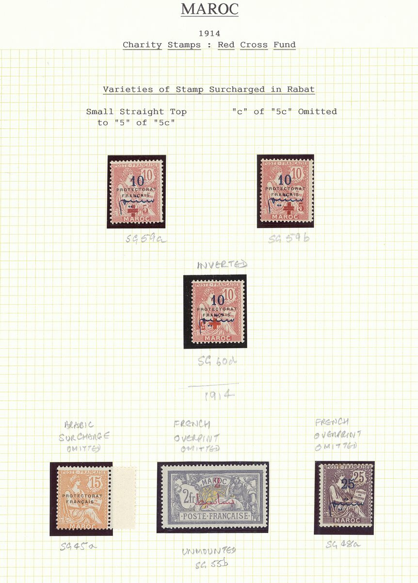 1914 varieties mint selection including 1914-22 15c. on 15c. "Arabic surcharge omitted" (S.G. 45a), 25c. "French overprint omitted" (S.G. 48a), 2f. unmounted "French overprint omitted" (S.G. 55b), 1914-17 Red Cross 10c.+5c. ""5" with small straight top (S.G. 59a), 10c. +5c. ""c" omitted" (S.G. 59b), 10c.+5c. "surcharge inverted" (S.G. 60d), mixed condition generally fine. Photo