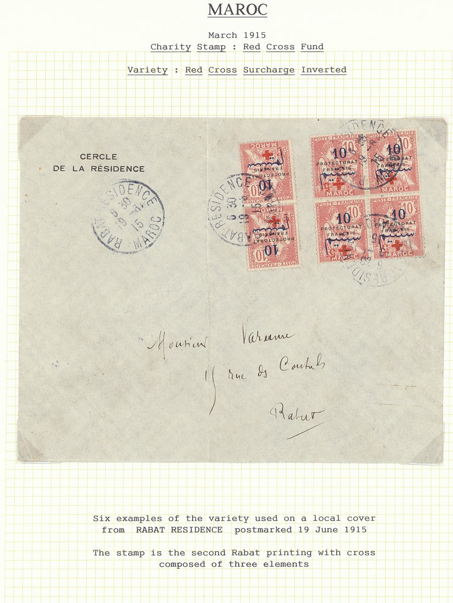 1915 10c.+5c. carmine, variety "surcharge inverted" block of four and vertical pair on cover addressed to Rabat, cancelled by "Rabat Residence" date stamp for "19 6 15", a vertical archive fold not affecting the adhesives, nevertheless a very rare and showpiece item. S.G. 60d. Photo