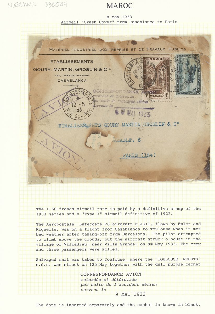 1933 Crash Cover from Casablanca addressed to Paris, stamps cancelled by "Casablanca" date stamp for "8 5 33", then on the 9th the plane crashed in Villadrau near Villa Grande, consequently the salvaged mail was taken to Toulouse where the "Toulouse rebuts" date stamp for "12 5 33" was struck together with "correspondance avion/retardee et deteroiree/par suite de l'accident aerien/servenue le9 MAI 1933" cachet in purple, a nice piece of history, Nierinck 330509 .