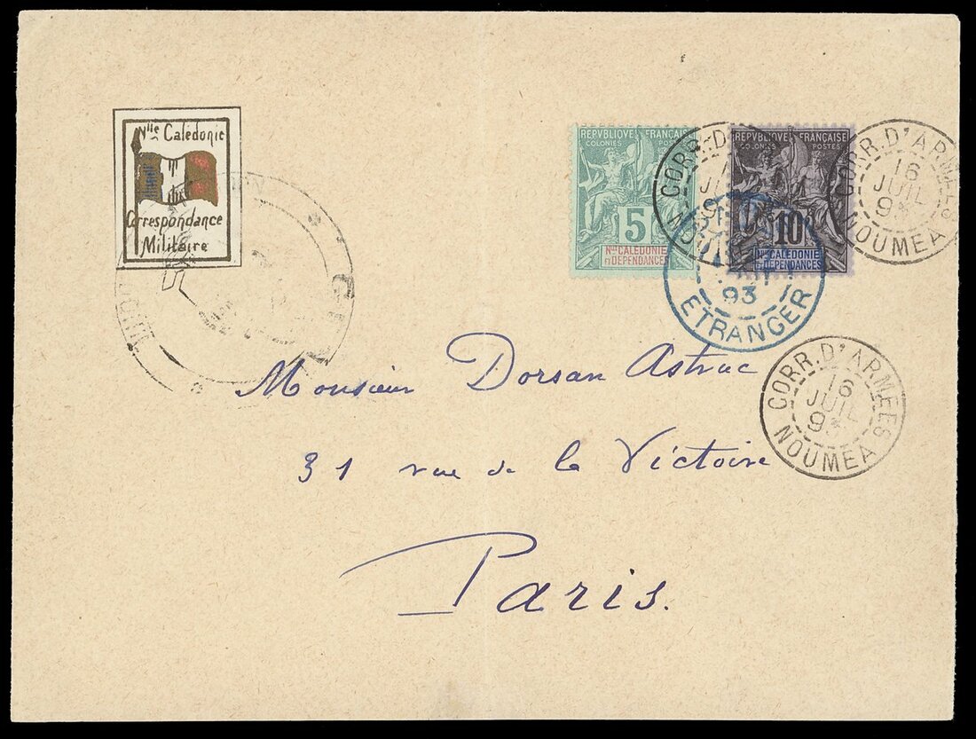 1893 (16 July) envelope to Paris franked 5c. and 10c. with Corr D'Armee/Noumea, red, blue and gold Correspondence Militaire vignette tied by Military cachet, arrival datestamp on reverse; the envelope with vertical crease; fine and scarce