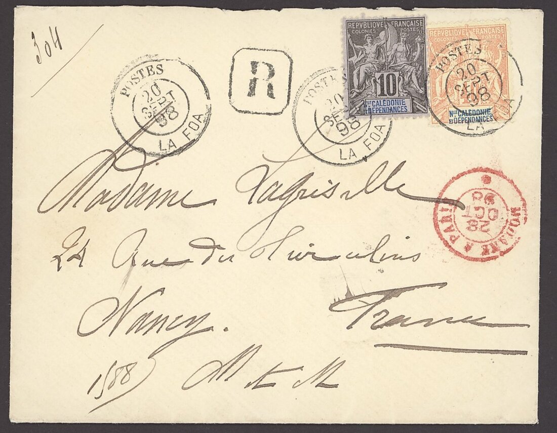 La Foa: 1898 (20 Sept.) envelope registered to Nancy franked 10c. and 40c. with Postes/La Foa cancellations, red Modane a Paris railway arrival marking, transit and arrival datestamp on reverse, fine and extremely rare.