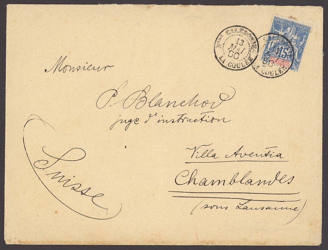 La Coulee: 1900 (13 May) envelope to Switzerland franked 15c. with Nlle Caledonie/La Coulee cancellation, transit and arrival markings on reverse, fine. A rare envelope from a small office, underpaid by 10c. but not taxed on arrival.