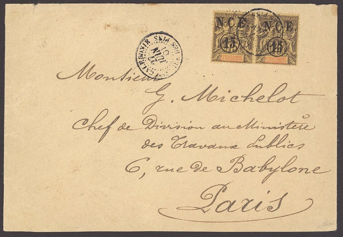 Ile des Pins: 1900 (27 June) envelope to Paris franked 1899-1901 15c. on 75c. pair with Nlle. Caledonie/Ile des Pins cancellation, transit, arrival markings and Official Ile des Pins cachet on reverse; fine
